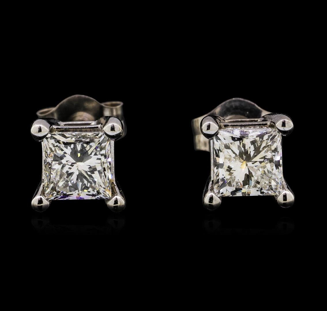 One pair electronically tested 14KT white gold lady's combination cast & assembled fashion stud earrings with threaded posts and push-on/screw-off backs with a bright polish finish. Identified with markings of '14K'. Condition is new, good workmanship. Containing: Two prong set princess cut diamonds, measuring 4.12 x 4.03 x 3.02mm (depth est.) approximate total weight of 2 Stones = 0.97ct. The featured diamonds are Canadian in origin. Graded in the setting in the GGI Laboratory, report numbers CID0846B1119988 and CID0846B1119989. Color H Clarity SI-2 to I-1 Cut Good. Total Weight of Diamonds 0.97ct.. Total Weight of Earrings 1.50gm GAS Appraised at $4020.00. GAS Appraised at $4,020.00.