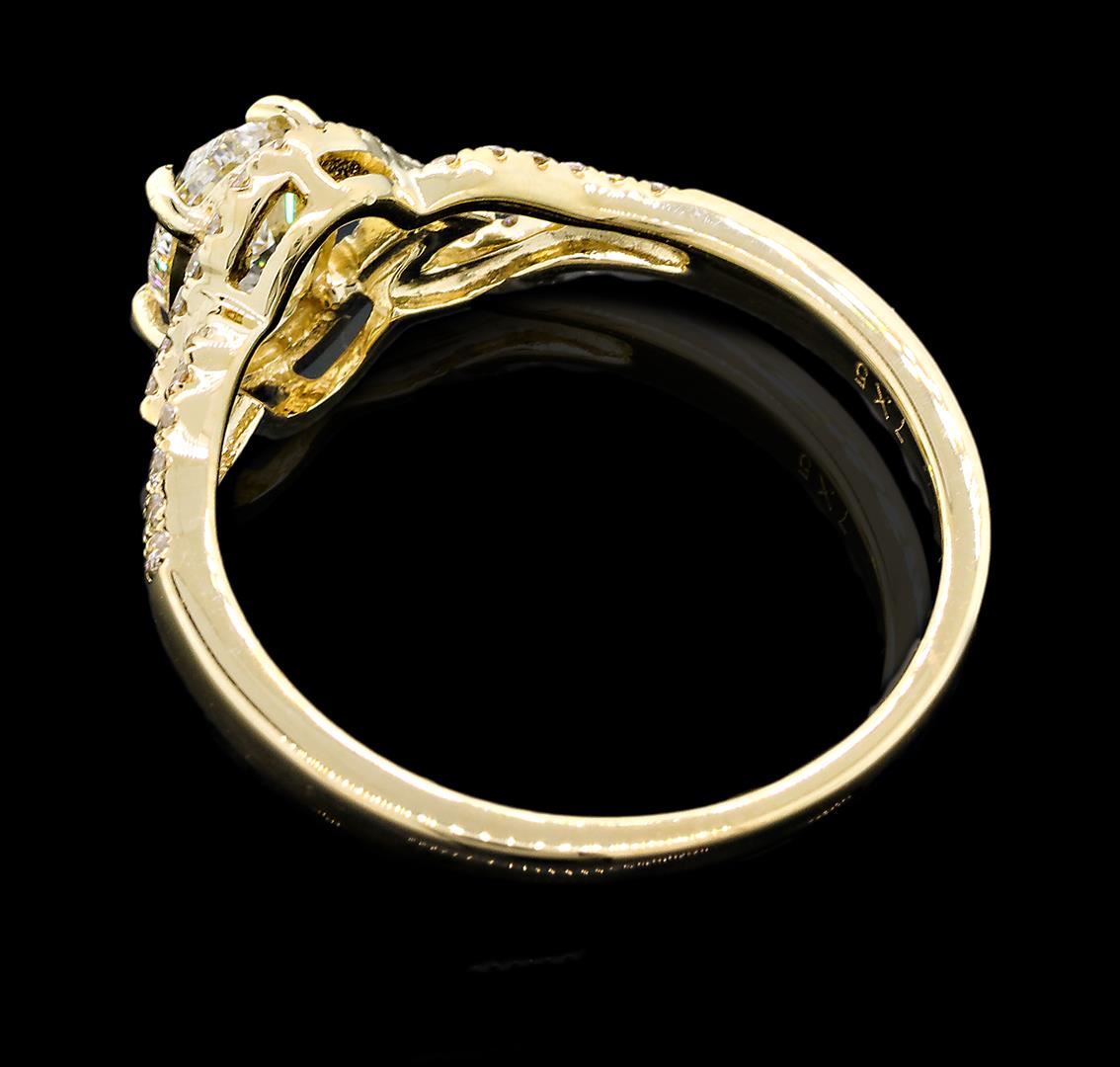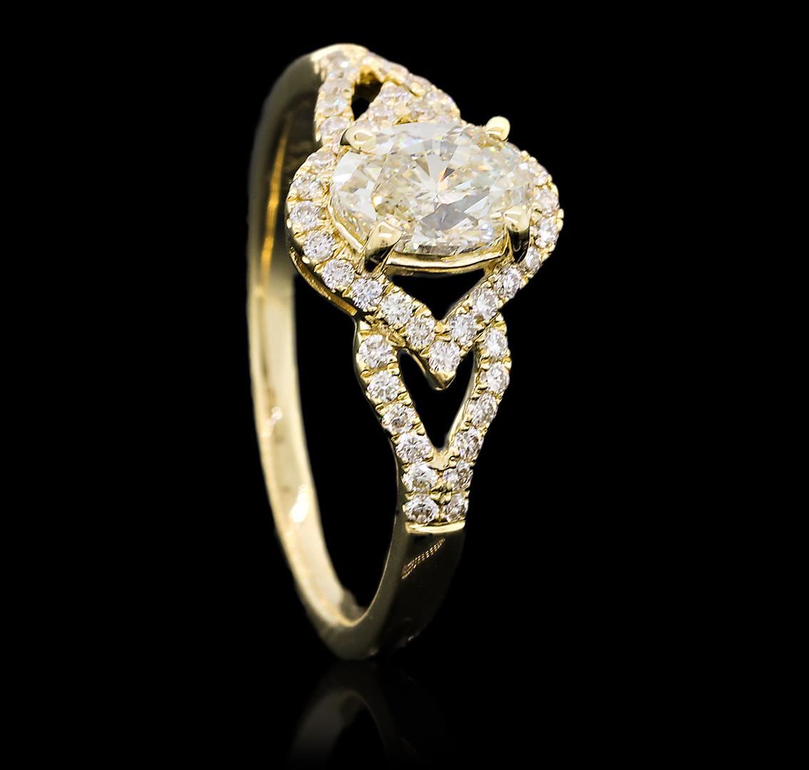One electronically tested 14KT yellow gold lady's cast wedding ring with a split bypass shank with a bright polish finish. The featured lady's ring has a shank measuring 1.57 millimeters wide. Identified with markings of '14K'. Condition is new, good workmanship. Containing: One prong set oval shaped cut diamond, measuring 6.55 x 4.52 x 3.30mm (depth est.) , 10.00.%. GTCF approximate weight of 0.71ct. Graded in the setting. Color K - L Clarity VS-1 Cut Very Good Forty-Eight prong set round brilliant cut diamonds, measuring 1.20 - 1.10 x 0.69mm (depth est.) approximate total weight of 48 Stones = 0.26ct. Graded in the setting. Color H - I Clarity SI-1 to SI-2 Cut Very Good. Total Weight of Diamonds 0.97ct.. Total Weight of Ring 2.60gm GAS Appraised at $5,965.00.