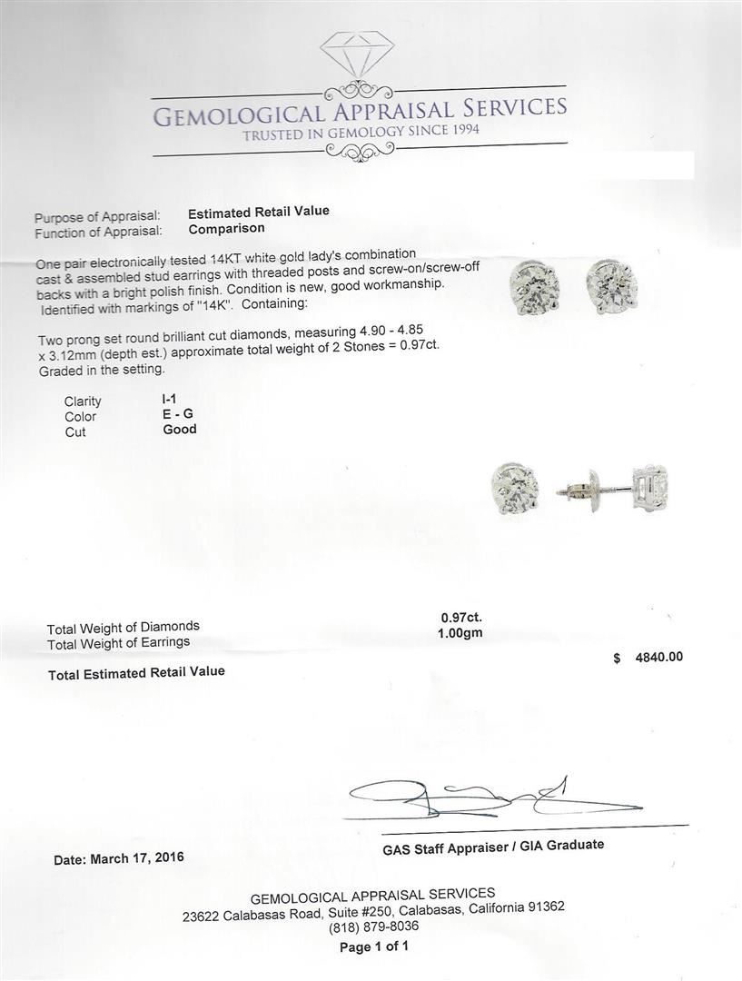 One pair electronically tested 14KT white gold lady's combination cast & assembled stud earrings with threaded posts and screw-on/screw-off backs with a bright polish finish. Identified with markings of "14K". Condition is new, good workmanship. Containing: Two prong set round brilliant cut diamonds, measuring 4.90 - 4.85 x 3.12mm (depth est.) approximate total weight of 2 Stones = 0.97ct. Graded in the setting. Clarity: I-1. Color: E - G. Cut: Good. Total Weight of Diamonds 0.97ct. Total Weight of Earrings 1.00gm. GAS Appraised at $4,840.00.