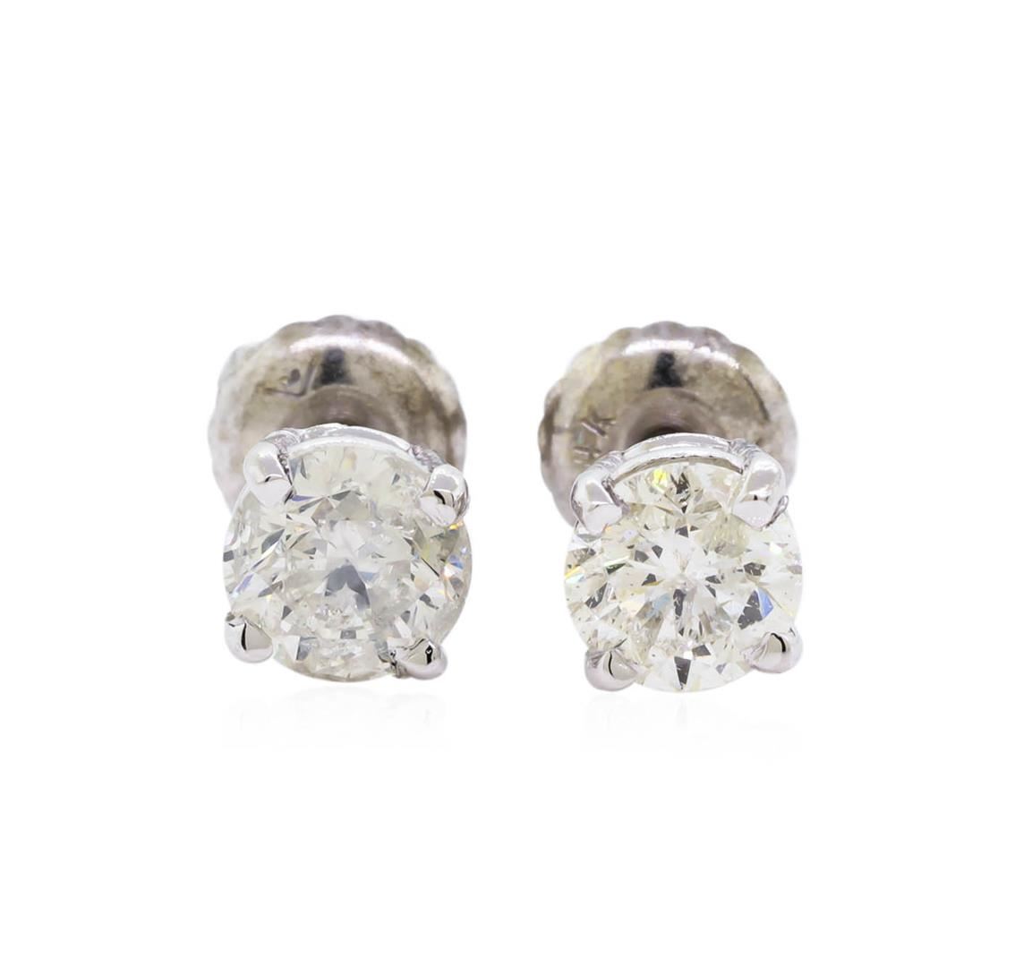 One pair electronically tested 14KT white gold lady's combination cast & assembled stud earrings with threaded posts and screw-on/screw-off backs with a bright polish finish. Identified with markings of "14K". Condition is new, good workmanship. Containing: Two prong set round brilliant cut diamonds, measuring 5.00 - 4.75 x 3.07mm (depth est.) , 5.00.%. GTCF approximate total weight of 2 Stones = 0.97ct. Graded in the setting. Clarity: SI-2 to I-1. Color: F - H. Cut Very Good. Total Weight of Diamonds 0.97ct. Total Weight of Earrings 1.10gm. GAS Appraised at $6,220.00.