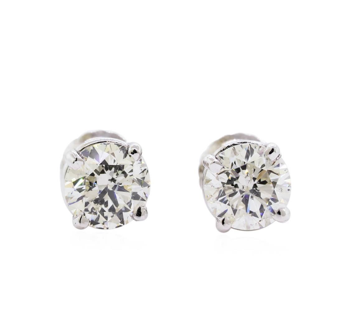 One pair electronically tested 14KT white gold lady's combination cast & assembled stud earrings with threaded posts and screw-on/screw-off backs with a bright polish finish. Identified with markings of "14K". Condition is new, good workmanship. Containing: Two prong set round brilliant cut diamonds, measuring 4.90 - 4.85 x 3.12mm (depth est.) approximate total weight of 2 Stones = 0.97ct. Graded in the setting. Clarity: I-1. Color: E - G. Cut: Good. Total Weight of Diamonds 0.97ct. Total Weight of Earrings 1.00gm. GAS Appraised at $4,840.00.