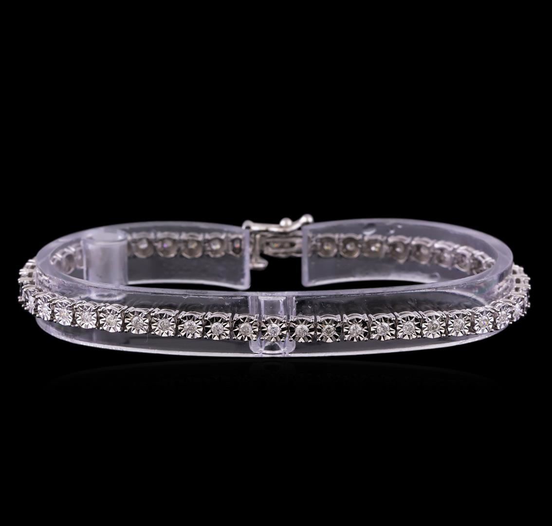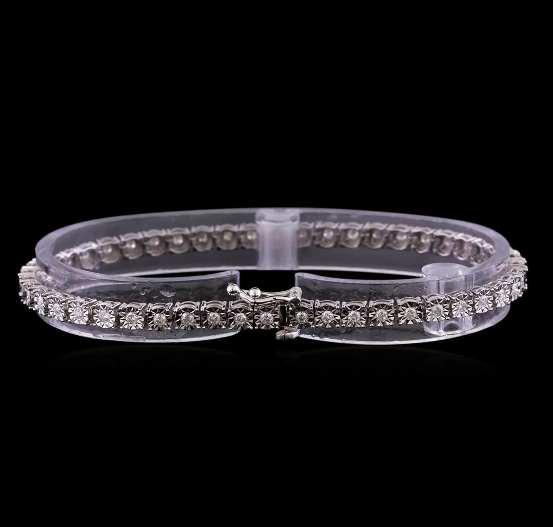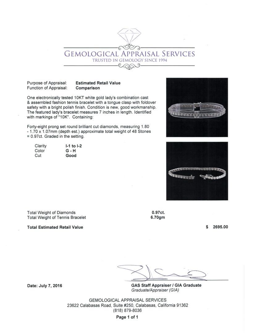 One electronically tested 10KT white gold lady's combination cast & assembled fashion tennis bracelet with a tongue clasp with foldover safety with a bright polish finish. The featured lady's bracelet measures 7 inches in length. Identified with markings of '10K'. Condition is new, good workmanship. Containing: Forty-Eight prong set round brilliant cut diamonds, measuring 1.80 - 1.70 x 1.07mm (depth est.) approximate total weight of 48 Stones = 0.97ct. Graded in the setting. Clarity I-1 to I-2. Color: G - H Cut Good. Total Weight of Diamonds 0.97ct.. Total Weight of Tennis Bracelet 6.70gm. GAS Appraised at $2,695.00.