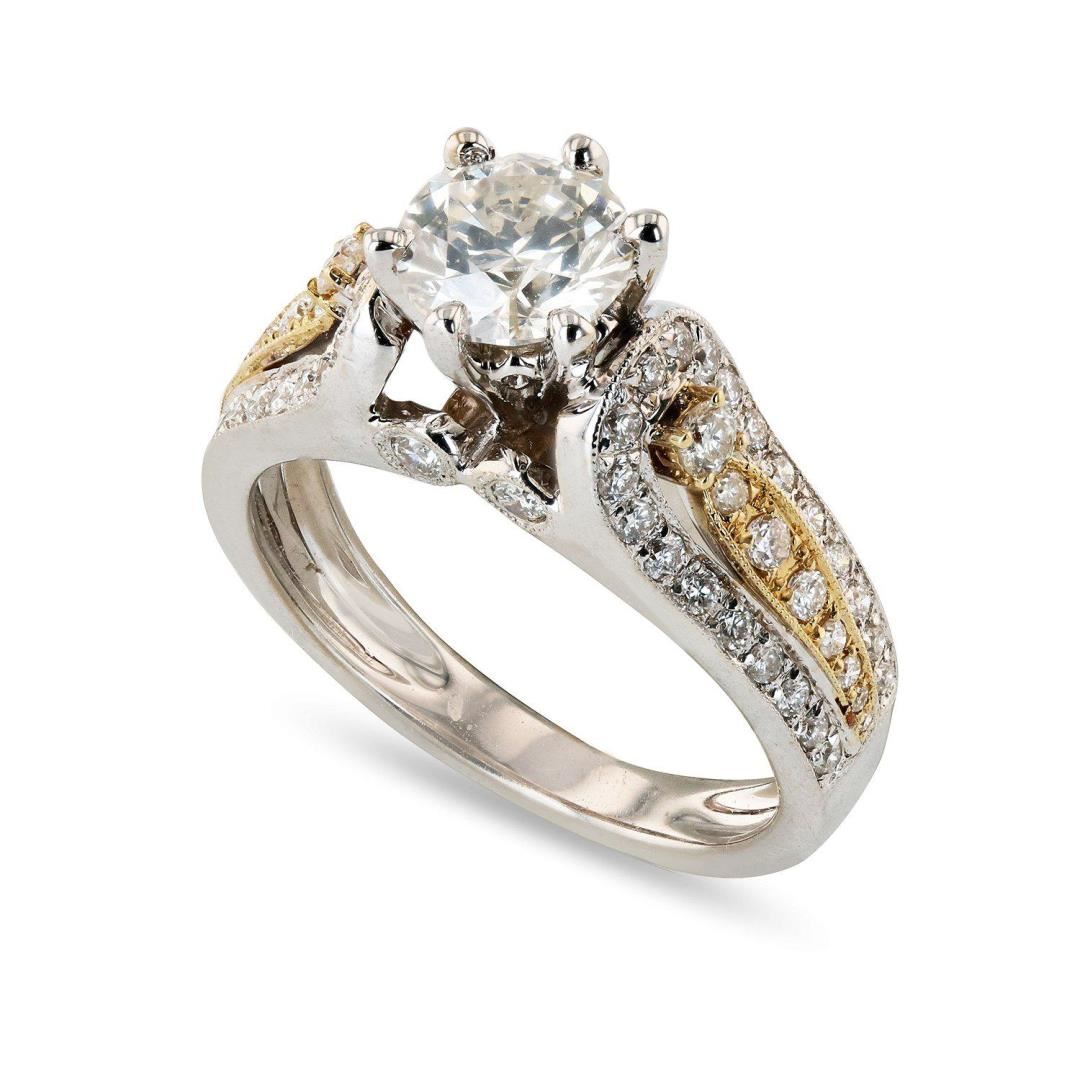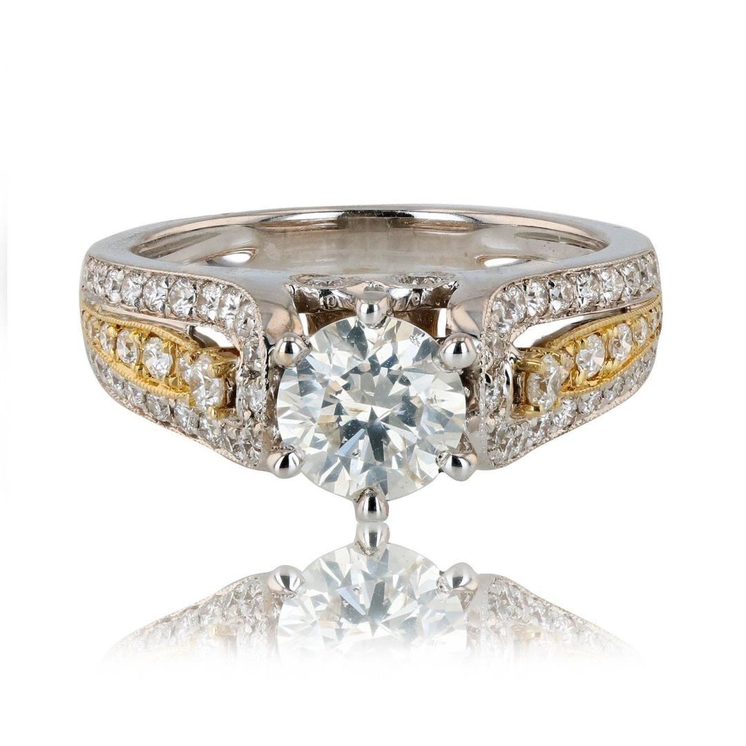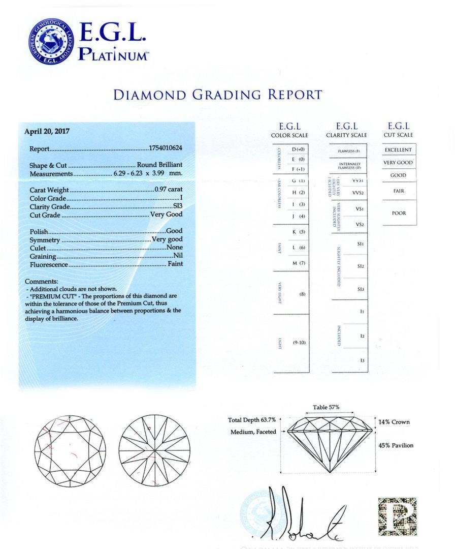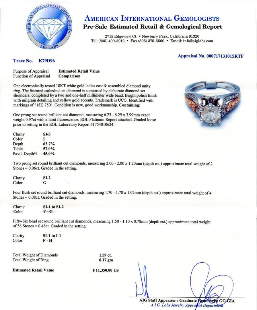 One electronically tested 18KT white gold ladies cast and assembled diamond unity ring The featured cathedral set diamond is supported by elaborate diamond set shoulders, completed by a two and one-half millimeter wide band. Bright polish finish with Mil grain detailing and yellow gold accents. Trademark is UCG. Identified with markings of "18K 750". Condition is new, good workmanship. Containing: One prong set round brilliant cut diamond, measuring 6.23 - 6.29 x 3.99mm exact weight 0.97ct with a faint fluorescence. EGL Platinum Report attached. Graded loose prior to setting in the EGL Laboratory Report #1754010624. Clarity SI-3 Color I Depth 63.7% Table 57.0% Pavil. Depth% 45.0% Two prong set round brilliant cut diamonds, measuring 2.00 - 2.00 x 1.20mm (depth est.) approximate total weight of 2 Stones = 0.06ct. Graded in the setting. Clarity SI-2 Color G Four flush set round brilliant cut diamonds, measuring 1.70 - 1.70 x 1.02mm (depth est.) approximate total weight of 4 Stones = 0.08ct. Graded in the setting. Clarity SI-1 to SI-2 Color F - G Fifty-Six bead set round brilliant cut diamonds, measuring 1.50 - 1.10 x 0.78mm (depth est.) approximate total weight of 56 Stones = 0.48ct. Graded in the setting. Clarity SI-1 to I-1 Color F - H Total Weight of Diamonds 1.59 ct. Total Weight of Ring 6.17 gm