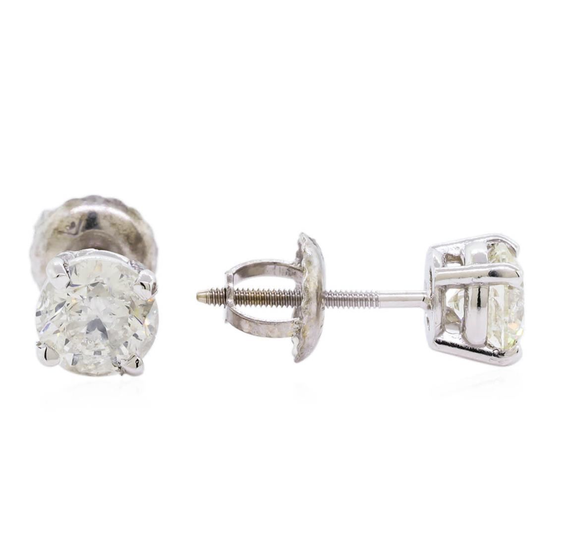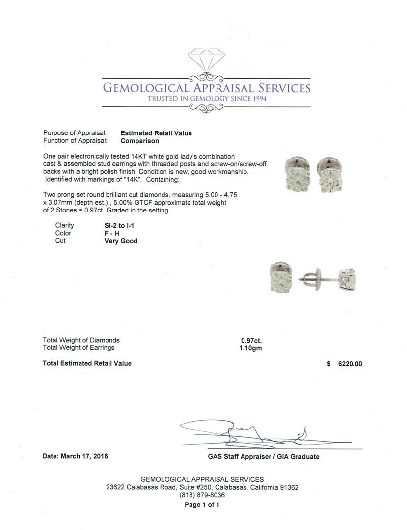 One pair electronically tested 14KT white gold lady's combination cast & assembled stud earrings with threaded posts and screw-on/screw-off backs with a bright polish finish. Identified with markings of "14K". Condition is new, good workmanship. Containing: Two prong set round brilliant cut diamonds, measuring 5.00 - 4.75 x 3.07mm (depth est.) , 5.00.%. GTCF approximate total weight of 2 Stones = 0.97ct. Graded in the setting. Clarity: SI-2 to I-1. Color: F - H. Cut Very Good. Total Weight of Diamonds 0.97ct. Total Weight of Earrings 1.10gm. GAS Appraised at $6,220.00.