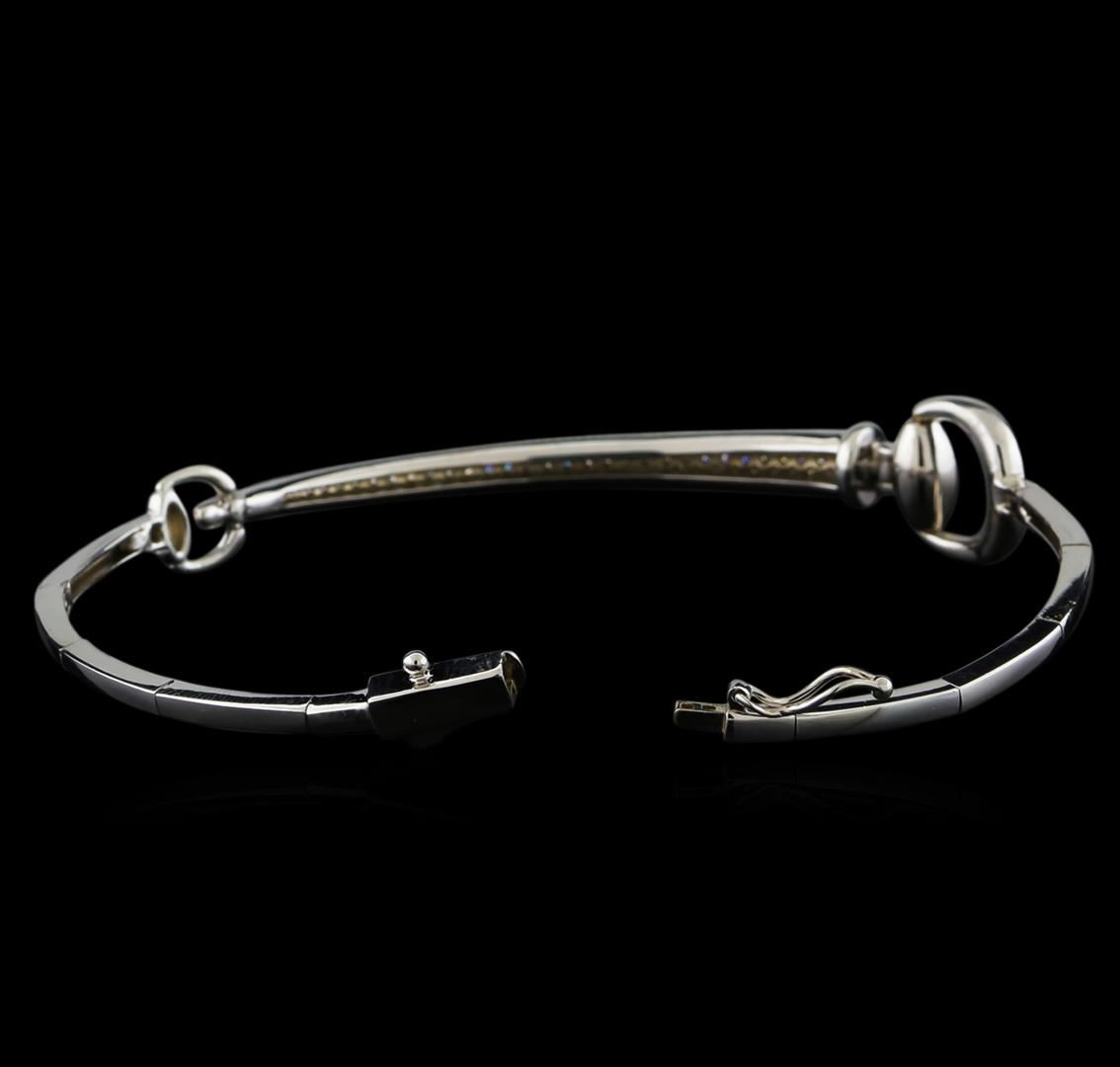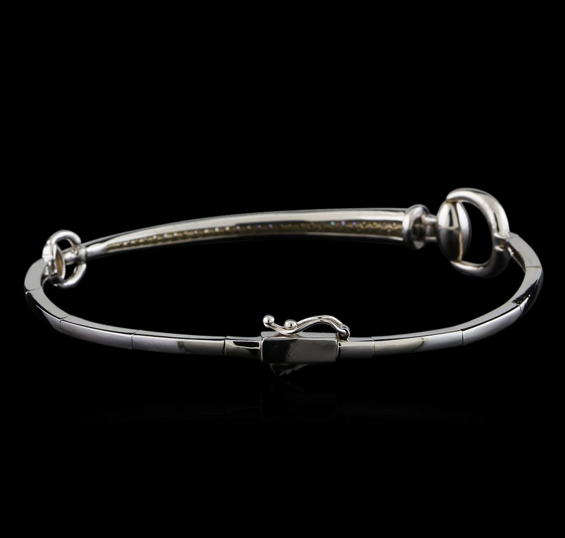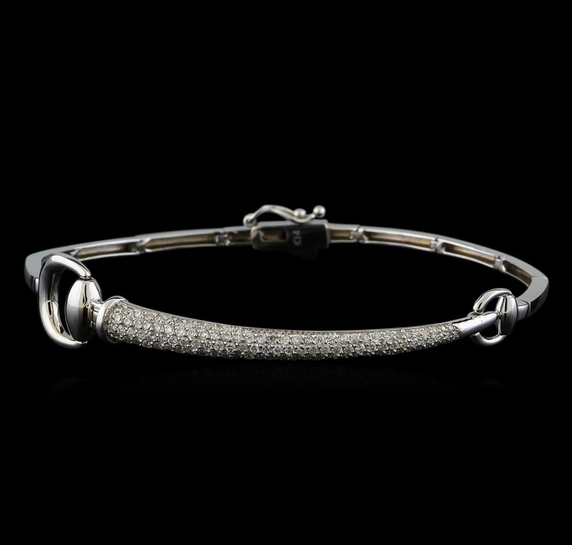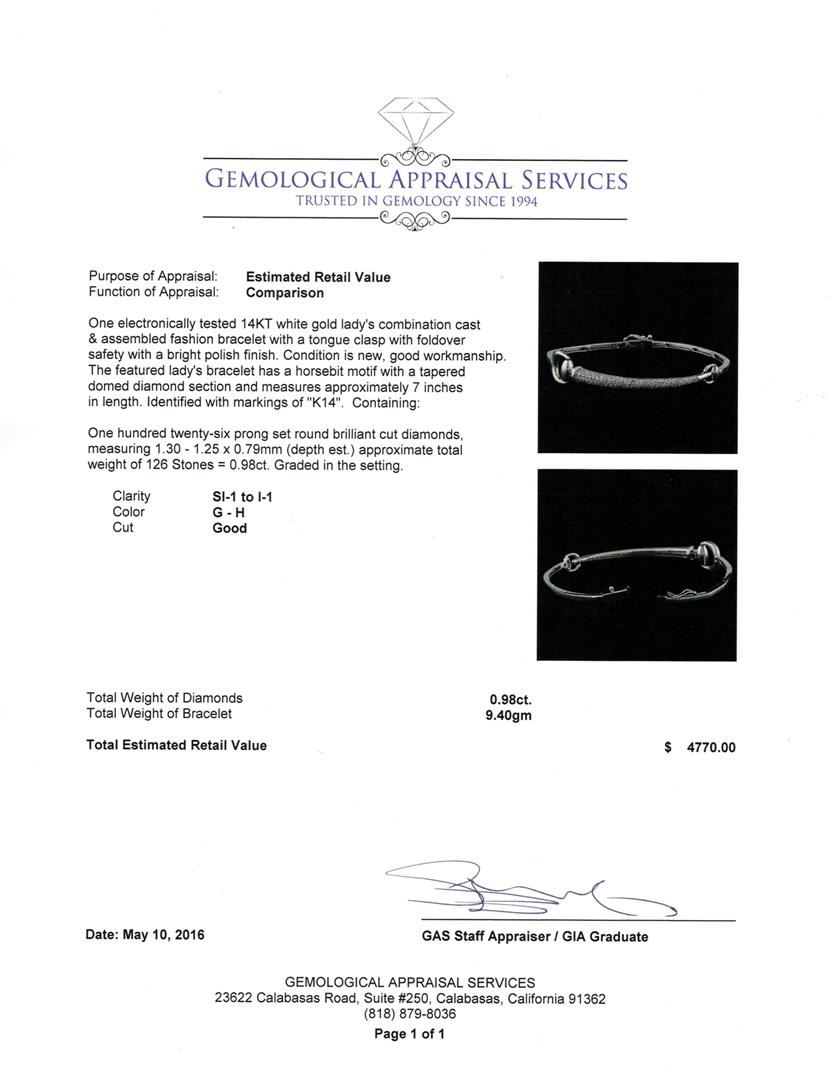 One electronically tested 14KT white gold lady's combination cast & assembled fashion bracelet with a tongue clasp with foldover safety with a bright polish finish. The featured lady's bracelet has a horse bit motif with a tapered domed diamond section and measures approximately 7 inches in length. Identified with markings of "K14". Condition is new, good workmanship. Containing: One Hundred Twenty-Six prong set round brilliant cut diamonds, measuring 1.30 - 1.25 x 0.79mm (depth est.) approximate total weight of 126 Stones = 0.98ct. Graded in the setting. Clarity: SI-1 to I-1. Color: G - H. Cut Good. Total Weight of Diamonds 0.98ct. Total Weight of Bracelet 9.40gm. GAS Appraised at $4,770.00.