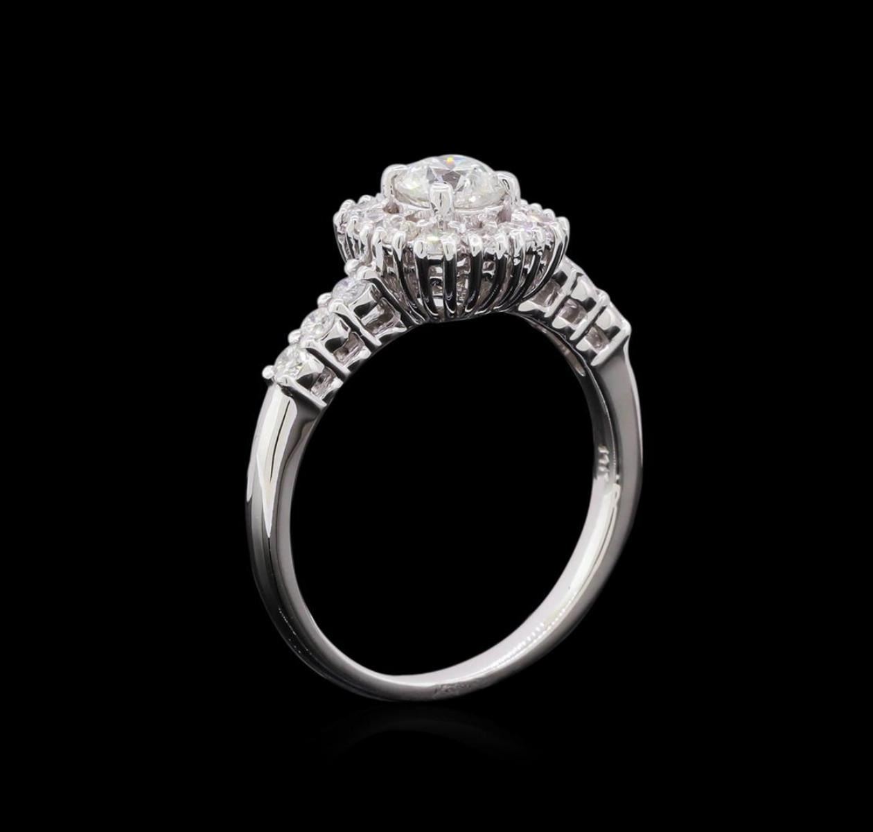 One electronically tested 14KT white gold lady's cast wedding ring with a basket halo with a bright polish finish. The featured lady's ring has a shank measuring 1.75 millimeters in width. Identified with markings of "14K". Condition is new, good workmanship. Containing: One prong set round brilliant cut diamond, measuring 4.90 - 4.87 x 3.17mm (depth est.) , 5.00.%. GTCF approximate weight of 0.51ct. Graded in the setting. Clarity: I-1. Color: I. Cut Good Fourteen prong set round brilliant cut diamonds, measuring 1.90 - 1.80 x 1.13mm (depth est.) approximate total weight of 14 Stones = 0.33ct. Graded in the setting. Clarity: SI-1 to SI-2. Color: H - I. Cut Good Four prong set round brilliant cut diamonds, measuring 2.20 - 2.10 x 1.31mm (depth est.) approximate total weight of 4 Stones = 0.14ct. Graded in the setting. Clarity: SI-1 to SI-2. Color: H - I. Cut Good. Total Weight of Diamonds 0.98ct. Total Weight of Ring 2.80gm. GAS Appraised.