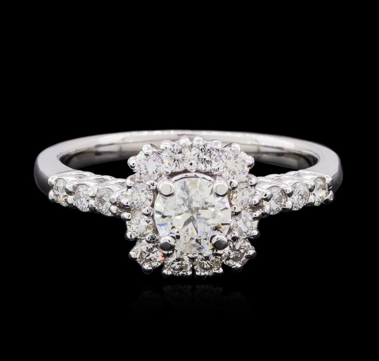 One electronically tested 14KT white gold lady's cast wedding ring with a basket halo with a bright polish finish. The featured lady's ring has a shank measuring 1.75 millimeters in width. Identified with markings of "14K". Condition is new, good workmanship. Containing: One prong set round brilliant cut diamond, measuring 4.90 - 4.87 x 3.17mm (depth est.) , 5.00.%. GTCF approximate weight of 0.51ct. Graded in the setting. Clarity: I-1. Color: I. Cut Good Fourteen prong set round brilliant cut diamonds, measuring 1.90 - 1.80 x 1.13mm (depth est.) approximate total weight of 14 Stones = 0.33ct. Graded in the setting. Clarity: SI-1 to SI-2. Color: H - I. Cut Good Four prong set round brilliant cut diamonds, measuring 2.20 - 2.10 x 1.31mm (depth est.) approximate total weight of 4 Stones = 0.14ct. Graded in the setting. Clarity: SI-1 to SI-2. Color: H - I. Cut Good. Total Weight of Diamonds 0.98ct. Total Weight of Ring 2.80gm. GAS Appraised.