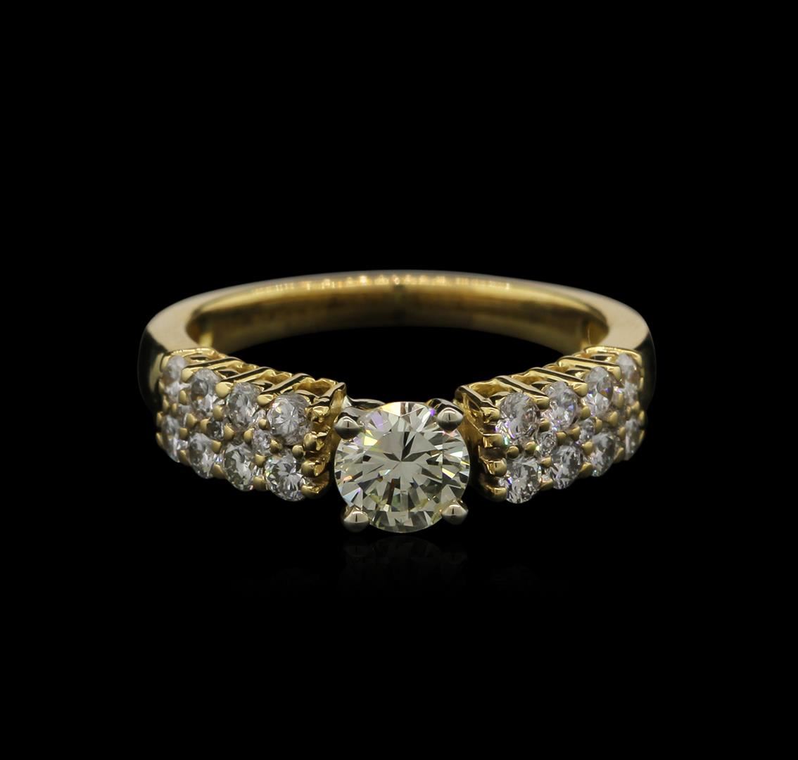 One ring featuring: 18KT yellow gold weighing 4.10 grams containing one prong set round diamond center stone with a total weight of 0.48ct and prong set round diamonds with a total weight of 0.50ct.