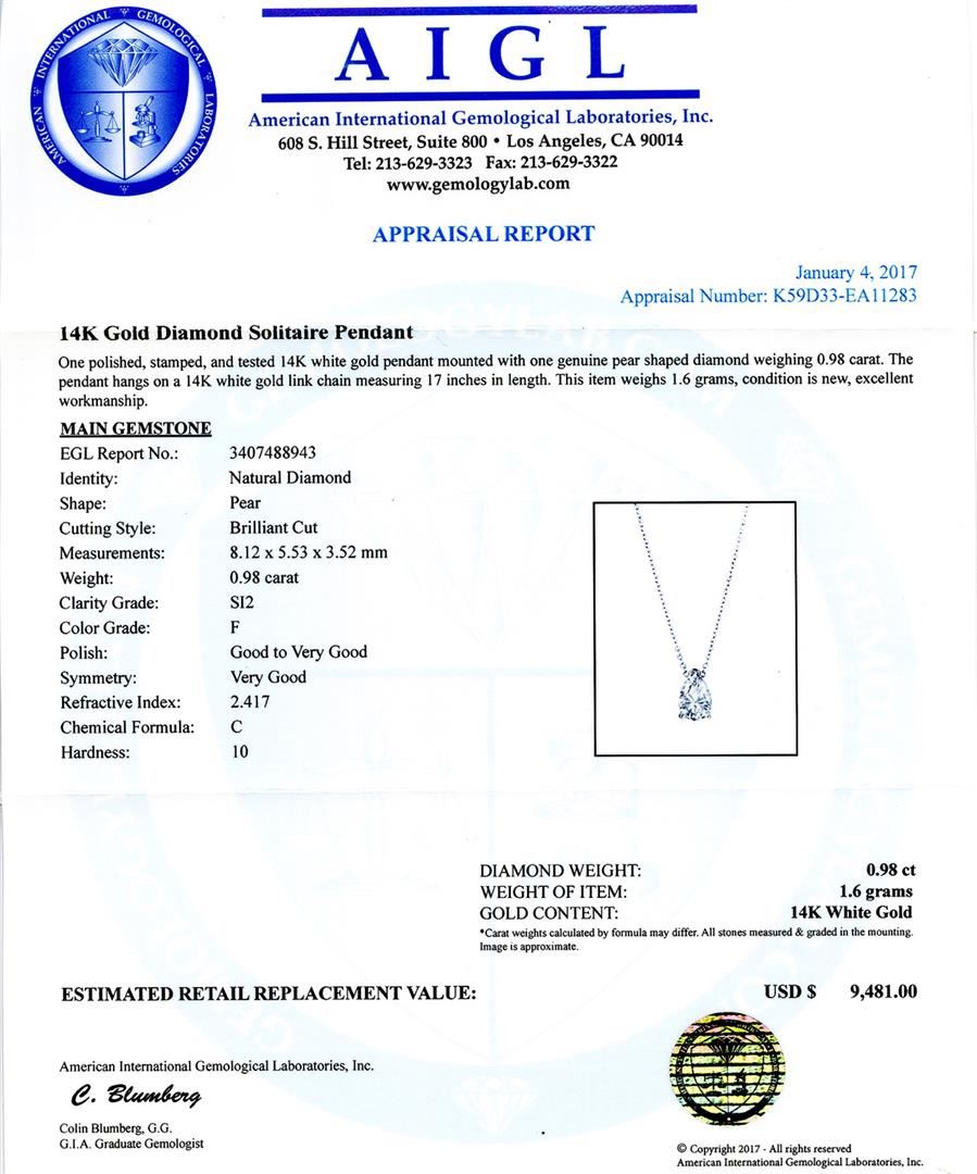 0.98ct Diamond Solitaire Pendant 14K White Gold Chain EGL CERTIFIED. Please see Photos and Description for all available information. This classic diamond pendant gives you the most classic and timeless look in an elegant 14K white gold chain. The diamond is set in a prong setting and is accompanied by EGL certification for the utmost quality and value for you. It's a timeless piece that you can wear day in and day out.