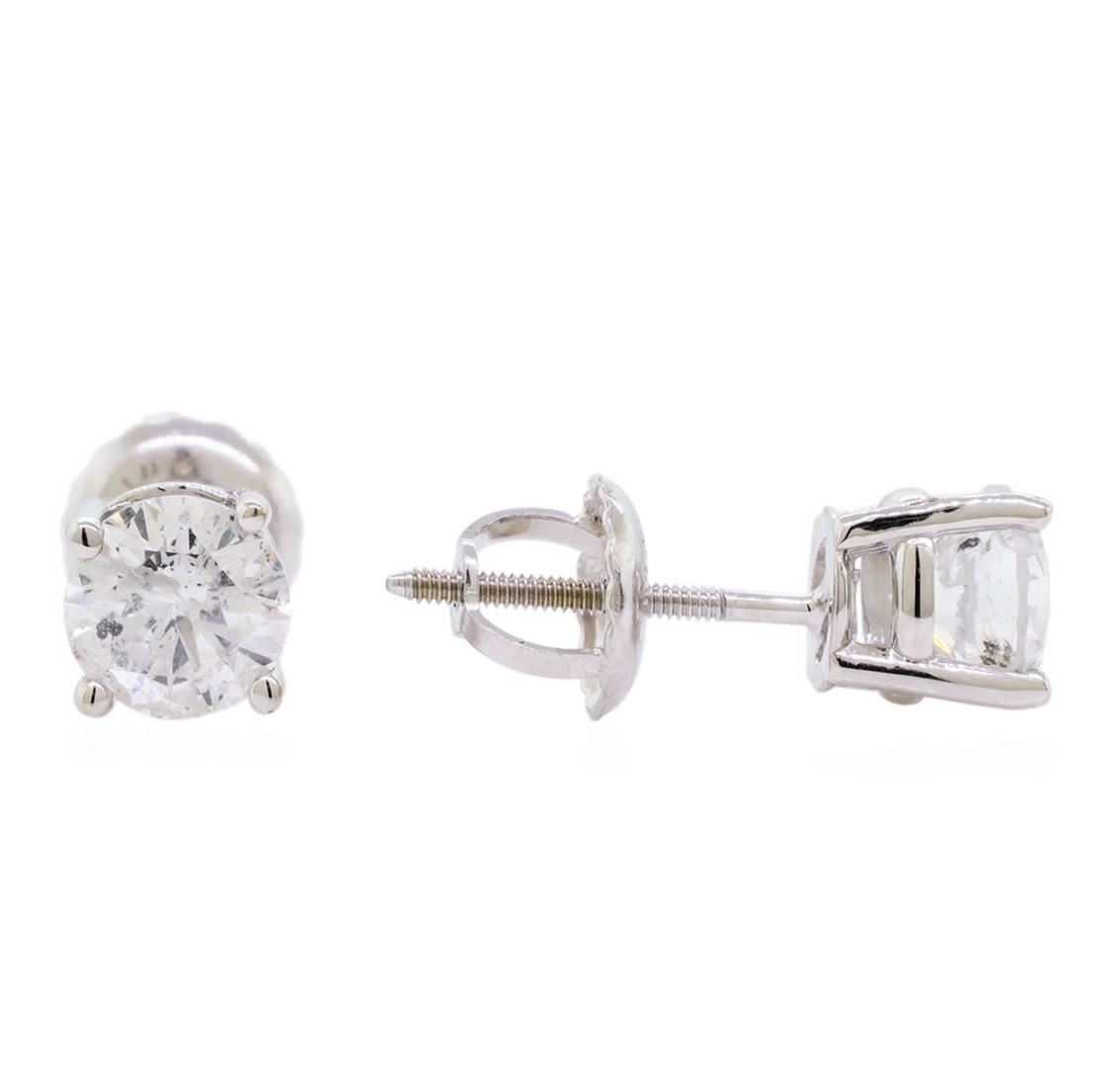 One pair electronically tested 14KT white gold lady's combination cast & assembled stud earrings with threaded posts and screw-on/screw-off backs with a bright polish finish. Identified with markings of "14K". Condition is new, good workmanship. Containing: Two prong set round brilliant cut diamonds, measuring 4.99 - 4.90 x 3.12mm (depth est.) , 5.00.%. GTCF approximate total weight of 2 Stones = 0.98ct. Graded in the setting. Clarity: I-1. Color: F - Good. Total Weight of Diamonds 0.98ct. Total Weight of Earrings 1.00gm. GAS Appraised at $5,005.00.