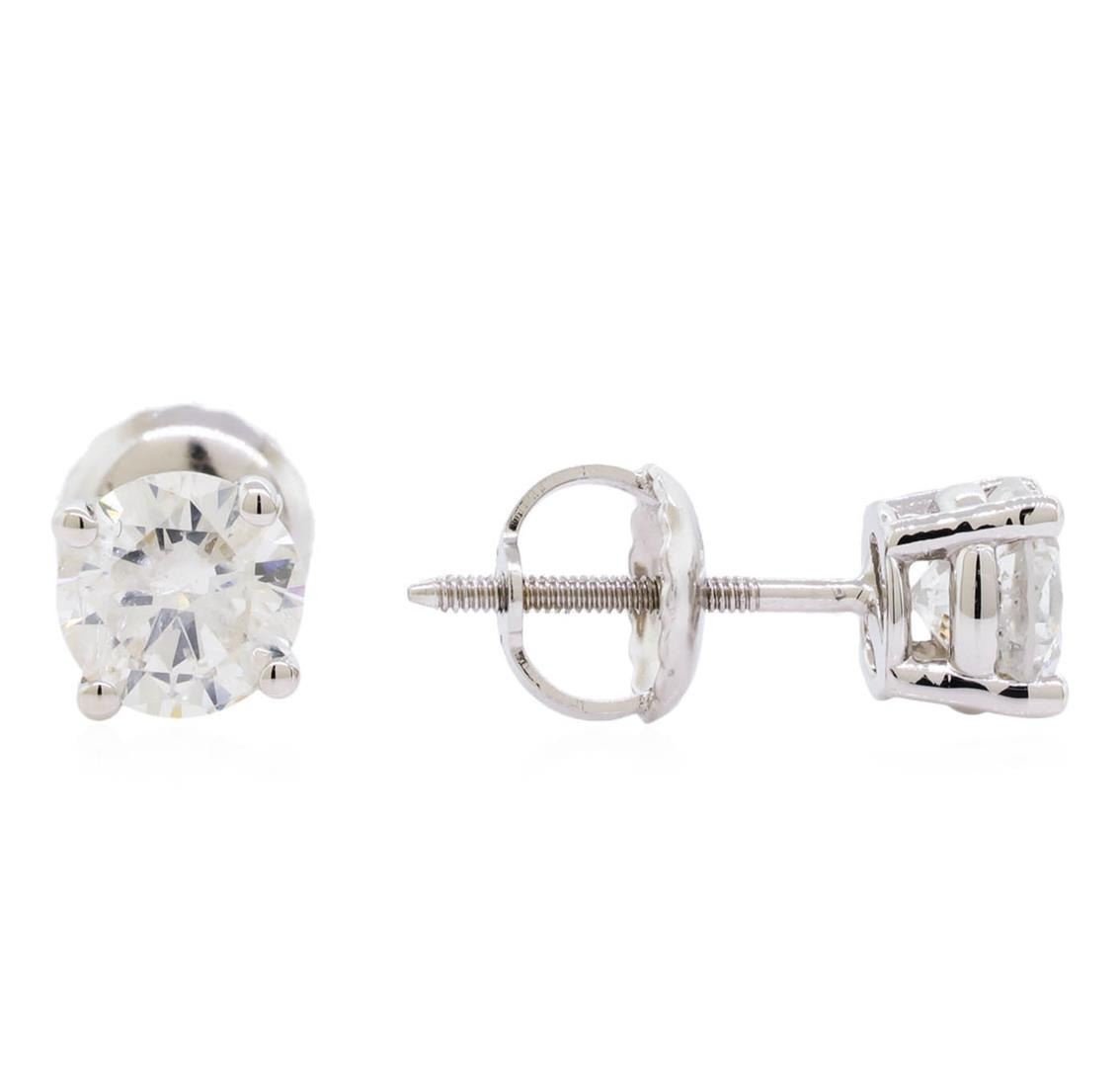 One pair electronically tested 14KT white gold lady's combination cast & assembled stud earrings with threaded posts and screw-on/screw-off backs with a bright polish finish. Identified with markings of "14K". Condition is new, good workmanship. Containing: Two prong set round brilliant cut diamonds, measuring 5.08 - 5.02 x 3.13mm (depth est.) approximate total weight of 2 Stones = 0.98ct. Graded in the setting. Clarity: SI-2 to I-1. Color: G - Good. Total Weight of Diamonds 0.98ct. Total Weight of Earrings 1.00gm. GAS Appraised at $5,005.00.