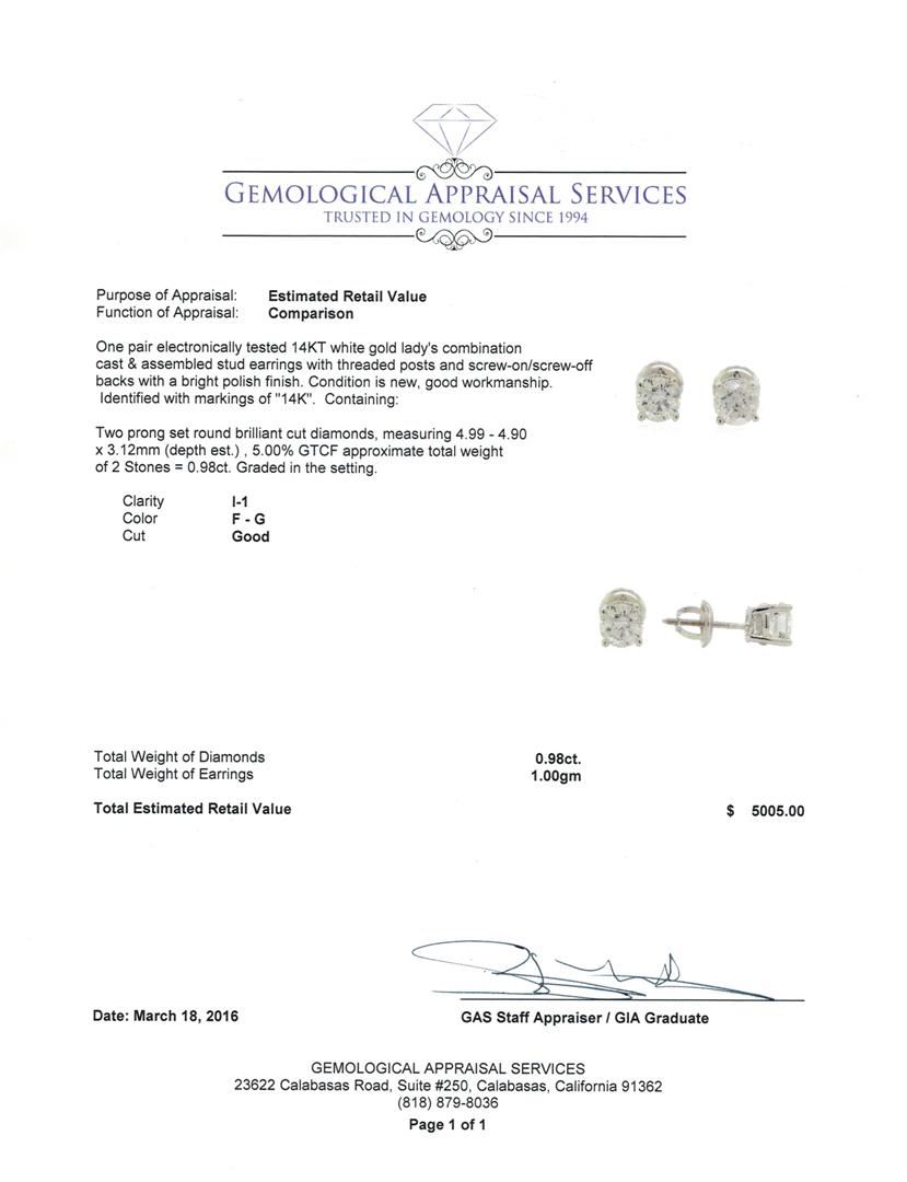 One pair electronically tested 14KT white gold lady's combination cast & assembled stud earrings with threaded posts and screw-on/screw-off backs with a bright polish finish. Identified with markings of "14K". Condition is new, good workmanship. Containing: Two prong set round brilliant cut diamonds, measuring 4.99 - 4.90 x 3.12mm (depth est.) , 5.00.%. GTCF approximate total weight of 2 Stones = 0.98ct. Graded in the setting. Clarity: I-1. Color: F - Good. Total Weight of Diamonds 0.98ct. Total Weight of Earrings 1.00gm. GAS Appraised at $5,005.00.