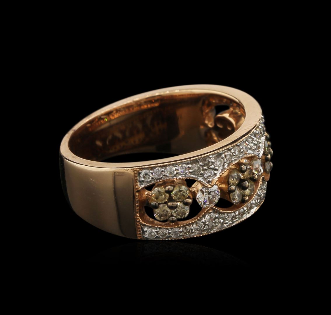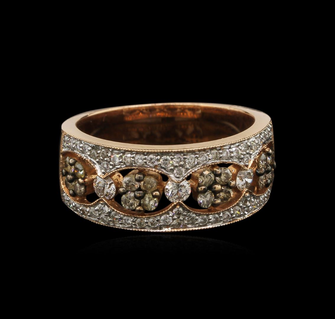 One electronically tested 14KT rose gold lady's cast fashion ring with a tapered shank with a bright polish with milgrain detailing finish. The featured lady's ring has a 2.5 millimeter wide shank. Identified with markings of "14K". Condition is new, good workmanship. Containing: Three channel set round brilliant cut diamonds, measuring 2.85 - 2.75 x 1.68mm (depth est.) approximate. Total Weight of 3 Stones = 0.24ct. Graded in the setting. Clarity: SI-1 to SI-2. Color: Very Good Sixteen shared prong set round brilliant cut diamonds, measuring 1.85 - 1.75 x 1.08mm (depth est.) approximate. Total Weight of 16 Stones = 0.34ct. Colored gemstones are presumed to have been subjected to commonly used enhancement processes. Hue ranges from brown to yellowish-brown. Graded in the setting. Clarity: SI-2 to I-1 Cut Good Fifty-Two shared prong set round brilliant cut diamonds, measuring 1.30 - 1.25 x 0.77mm (depth est.) approximate. Total Weight of 52 Stones = 0.40ct. Graded in the setting. Clarity: SI-1 to SI-2. Color: I - Good. Total Weight of Diamonds 0.98ct. Total Weight of Ring 6.70gm. GAS Appraised at $4,960.00.