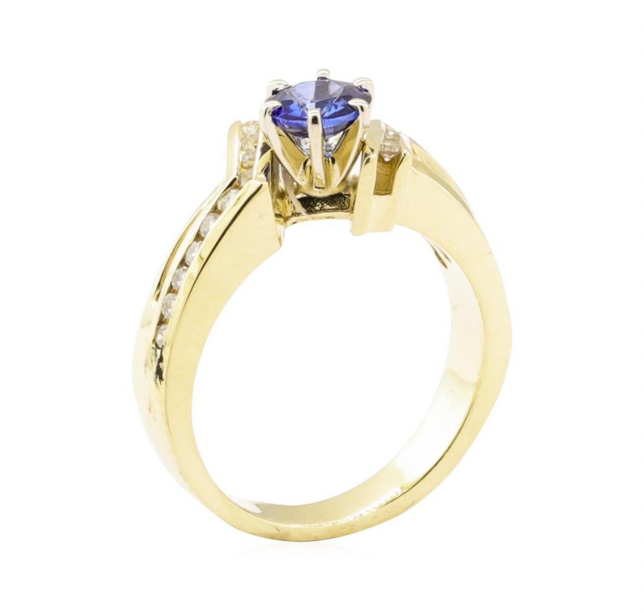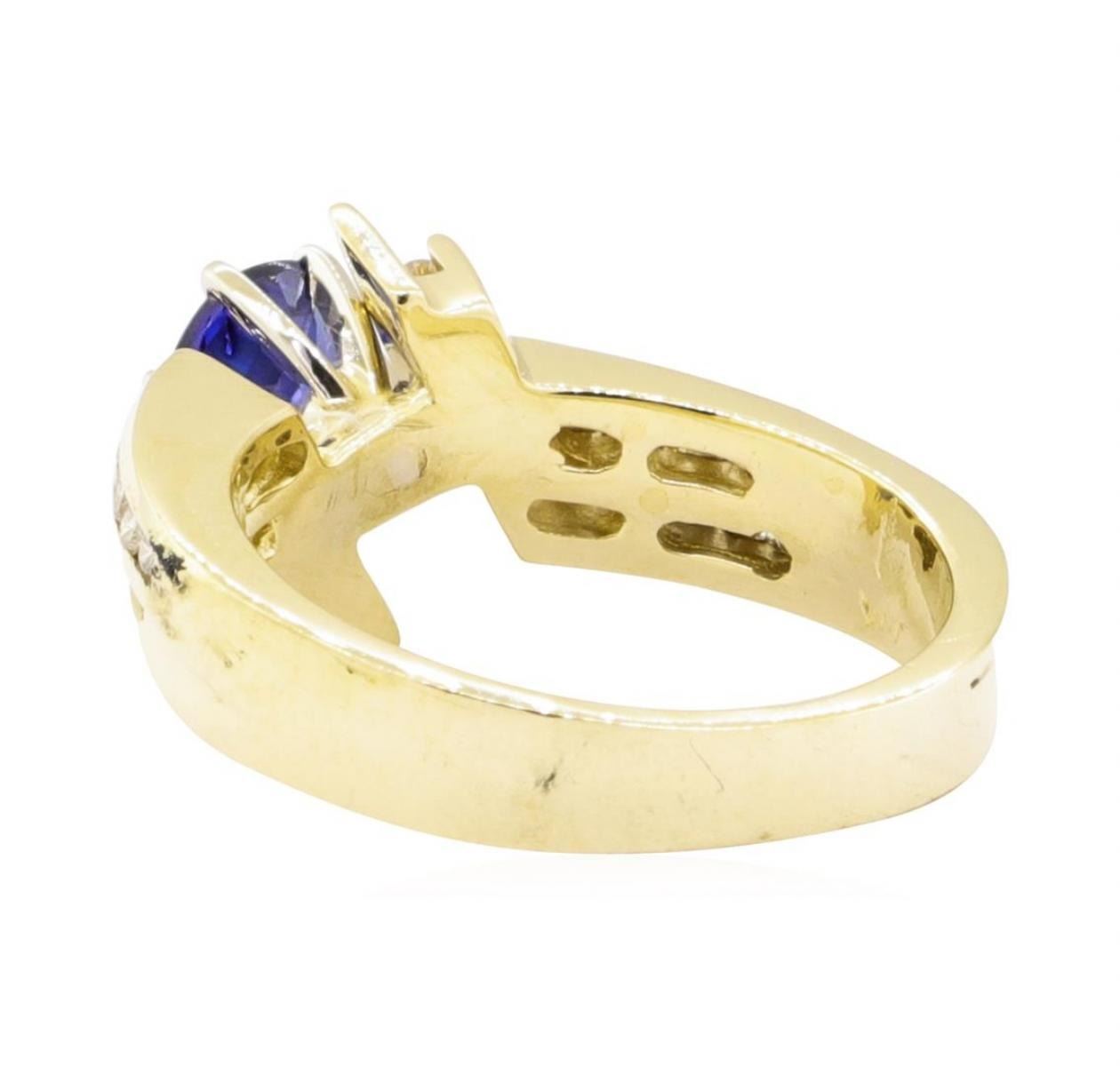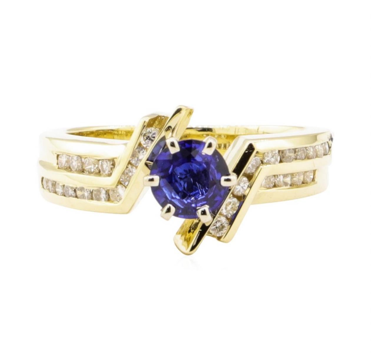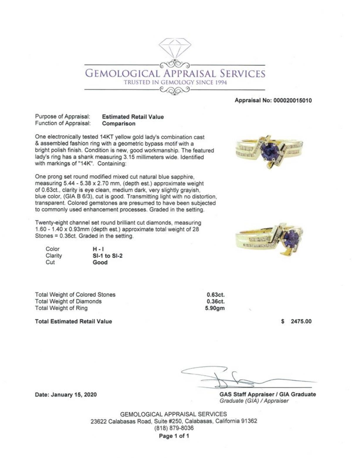 One electronically tested 14KT yellow gold lady's combination cast & assembled fashion ring with a geometric bypass motif with a bright polish finish. The featured lady's ring has a shank measuring 3.15 millimeters wide. Identified with markings of '14K'. Condition is new, good workmanship. Containing: One prong set round modified mixed cut natural blue sapphire, measuring 5.44 - 5.38 x 2.70 mm, (depth est.) approximate weight of 0.63ct., clarity is eye clean, medium dark, very slightly grayish, blue color, (GIA B 6/3), cut is good. Transmitting light with no distortion, transparent. Colored gemstones are presumed to have been subjected to commonly used enhancement processes. Graded in the setting. Twenty-Eight channel set round brilliant cut diamonds, measuring 1.60 - 1.40 x 0.93mm (depth est.) approximate total weight of 28 Stones = 0.36ct. Graded in the setting. Color H - I Clarity SI-1 to SI-2 Cut Good. Total Weight of Colored Stones 0.63ct.. Total Weight of Diamonds 0.36ct.. Total Weight of Ring 5.90gm GAS Appraised at $2475.00. GAS Appraised.