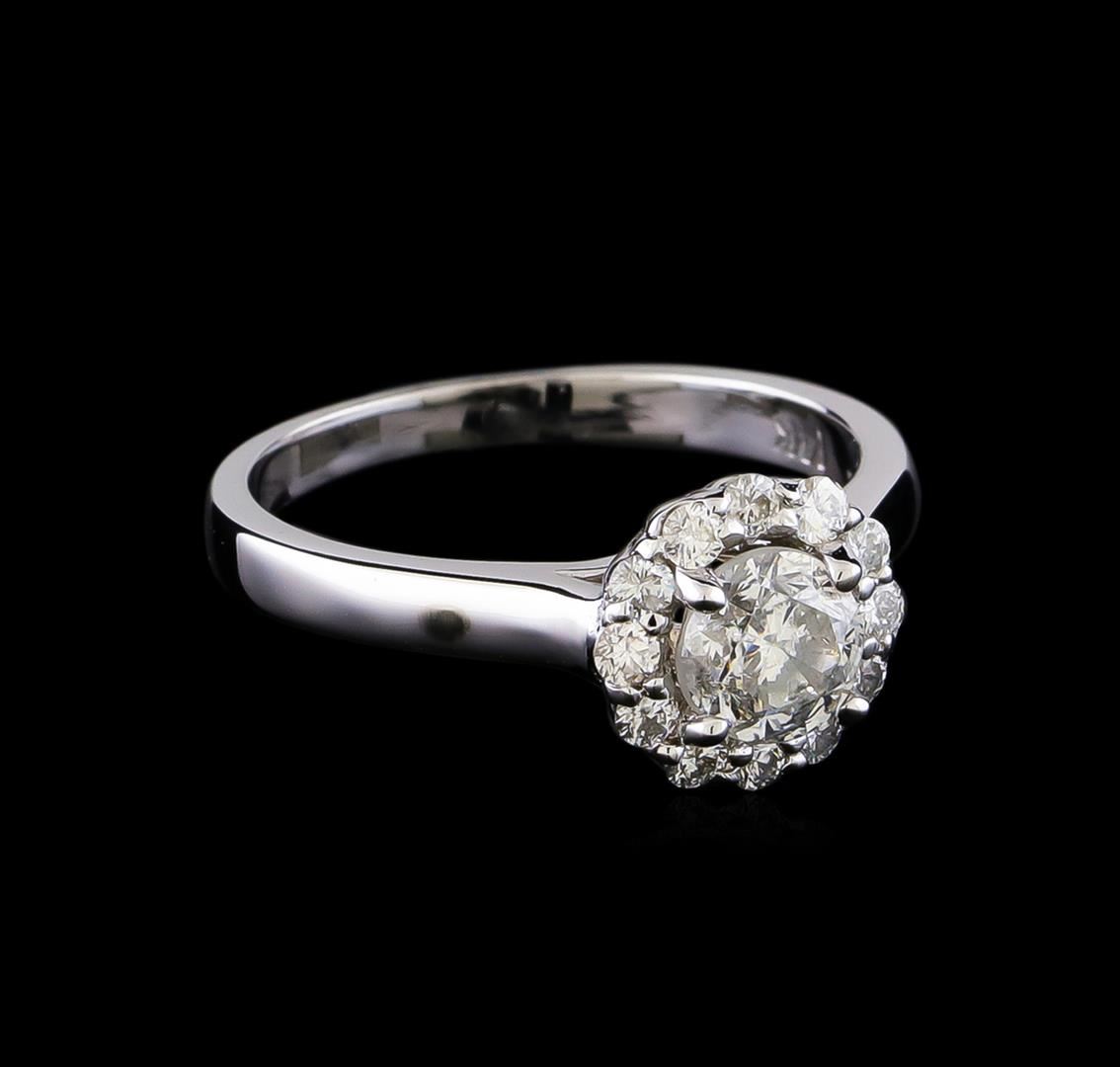 One electronically tested 14KT white gold lady's cast wedding ring with a basket halo with a bright polish finish. The featured lady's ring has a shank measuring 2.08 millimeters in width. Identified with markings of "14K". Condition is new, good workmanship. Containing: One prong set round brilliant cut diamond, measuring 5.46 - 5.44 x 3.38mm (depth est.) , 15.00.%. GTCF approximate weight of 0.72ct. Graded in the setting. Clarity: I-1. Color: Good Twelve prong set round brilliant cut diamonds, measuring 1.80 - 1.75 x 1.11mm (depth est.) approximate total weight of 12 Stones = 0.27ct. Graded in the setting. Clarity: SI-1 to SI-2. Color: H - I. Cut Good. Total Weight of Diamonds 0.99ct. Total Weight of Ring 3.50gm. GAS Appraised at $5,910.00.