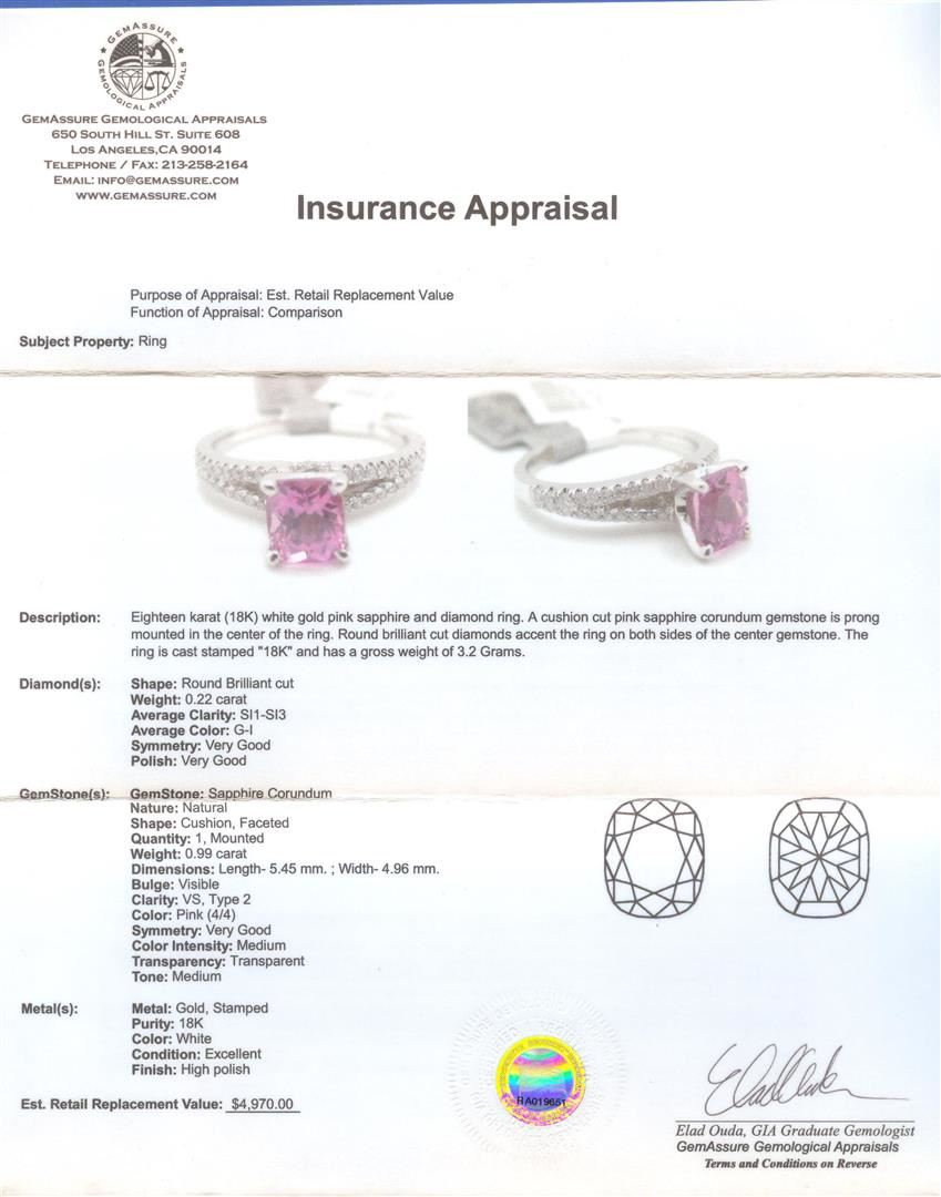 Eighteen karat (18K) white gold pink sapphire and diamond ring. A cushion cut pink sapphire corundum gemstone is prong mounted in the center of the ring. Round brilliant cut diamonds accent the ring on both sides of the center gemstone. The ring is cast stamped "18K" and has a gross weight of 3.2 Grams. Diamond(s): Shape: Round Brilliant cut. Weight: 0.22 carat. Average Clarity: SI1-SI3. Average Color: G-I. Symmetry: Very Good. Polish: Very Good. GemStone(s): GemStone: Sapphire Corundum. Nature: Natural. Shape: Cushion, Faceted. Quantity: 1, Mounted. Weight: 0.99 carat. Dimensions: Length- 5.45 mm ; Width- 4.96 mm. Bulge: Visible: Clarity: VS, Type 2. Color: Pink (4/4). Symmetry: Very Good. Color Intensity: Medium. Transparency: Transparent. Tone: Medium. Metal(s): Metal: Gold, Stamped. Purity: 18K. Color: White. Condition: Excellent. Finish: High polish. GGA Appraised at $4,970.00.