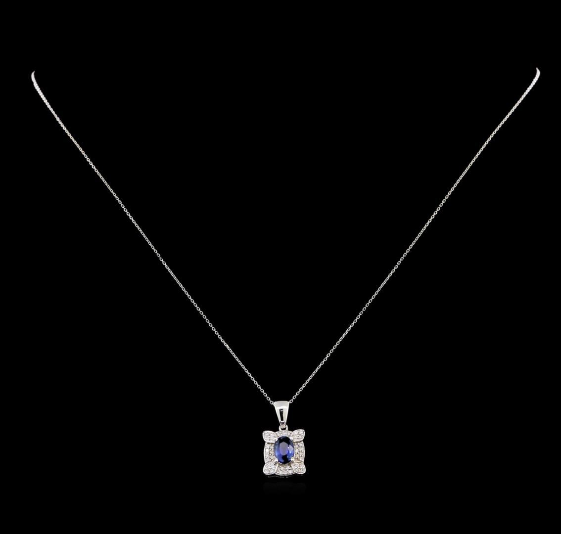 One electronically tested 14KT white gold ladies cast & assembled sapphire and diamond pendant with chain. The featured pendant is set within a stylized diamond bezel, completed by a white gold bail. The pendant is supported by an eighteen inch length 14KT white gold designer style chain terminating in a spring ring clasp. Bright polish finish. Trademark is Orianne. Identified with markings of "14K". Condition is new, good workmanship. Containing: One prong set oval mixed cut natural blue sapphire, measuring 7.00 x 5.00 x 3.30mm, approximate weight of 0.99ct., clarity is slightly included, type II, medium dark, very slightly grayish, blue color, (GIA B 6/3), cut is good. Transmitting light with a minimum of distortion, transparent. Naturally occurring internal & external characteristics are present, including partial color zoning. Graded in the setting. Forty prong set round brilliant cut diamonds approximate total weight of 40 Stones = 0.19ct. Graded in the setting. Clarity: I-1 to I-2. Color: G - I. Total Weight of Colored Stones 0.99ct. Total Weight of Diamonds 0.19ct. Total Weight of Pendant With Chain 2.91gm. AIG Appraised at $2,070.00.