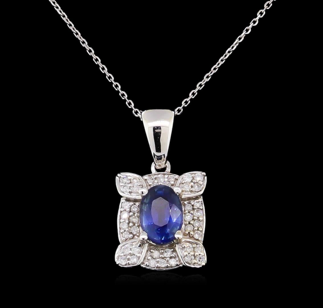 One electronically tested 14KT white gold ladies cast & assembled sapphire and diamond pendant with chain. The featured pendant is set within a stylized diamond bezel, completed by a white gold bail. The pendant is supported by an eighteen inch length 14KT white gold designer style chain terminating in a spring ring clasp. Bright polish finish. Trademark is Orianne. Identified with markings of "14K". Condition is new, good workmanship. Containing: One prong set oval mixed cut natural blue sapphire, measuring 7.00 x 5.00 x 3.30mm, approximate weight of 0.99ct., clarity is slightly included, type II, medium dark, very slightly grayish, blue color, (GIA B 6/3), cut is good. Transmitting light with a minimum of distortion, transparent. Naturally occurring internal & external characteristics are present, including partial color zoning. Graded in the setting. Forty prong set round brilliant cut diamonds approximate total weight of 40 Stones = 0.19ct. Graded in the setting. Clarity: I-1 to I-2. Color: G - I. Total Weight of Colored Stones 0.99ct. Total Weight of Diamonds 0.19ct. Total Weight of Pendant With Chain 2.91gm. AIG Appraised at $2,070.00.