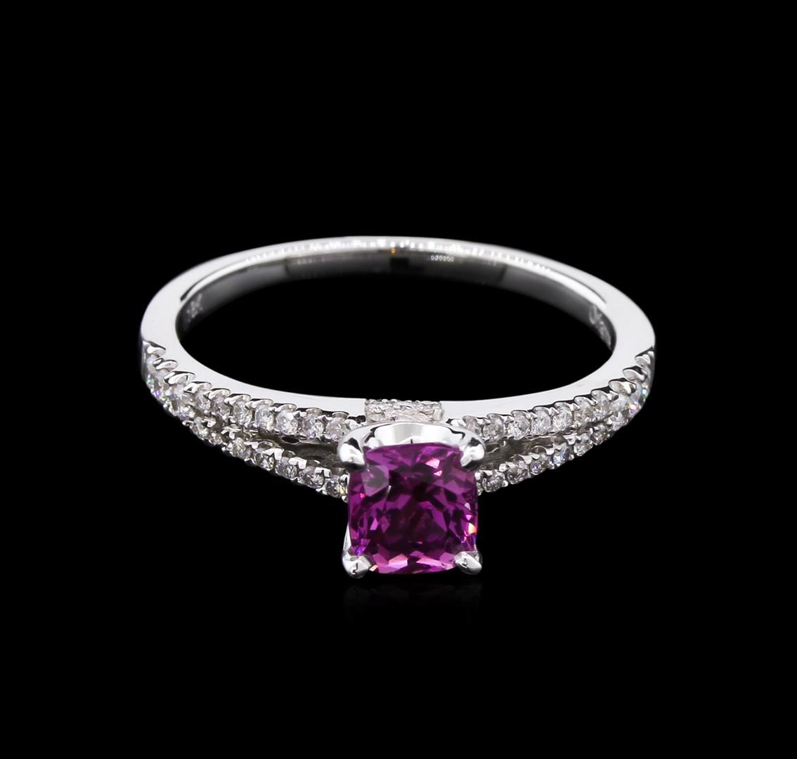 Eighteen karat (18K) white gold pink sapphire and diamond ring. A cushion cut pink sapphire corundum gemstone is prong mounted in the center of the ring. Round brilliant cut diamonds accent the ring on both sides of the center gemstone. The ring is cast stamped "18K" and has a gross weight of 3.2 Grams. Diamond(s): Shape: Round Brilliant cut. Weight: 0.22 carat. Average Clarity: SI1-SI3. Average Color: G-I. Symmetry: Very Good. Polish: Very Good. GemStone(s): GemStone: Sapphire Corundum. Nature: Natural. Shape: Cushion, Faceted. Quantity: 1, Mounted. Weight: 0.99 carat. Dimensions: Length- 5.45 mm ; Width- 4.96 mm. Bulge: Visible: Clarity: VS, Type 2. Color: Pink (4/4). Symmetry: Very Good. Color Intensity: Medium. Transparency: Transparent. Tone: Medium. Metal(s): Metal: Gold, Stamped. Purity: 18K. Color: White. Condition: Excellent. Finish: High polish. GGA Appraised at $4,970.00.