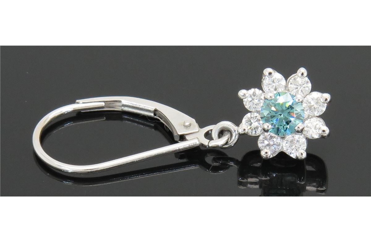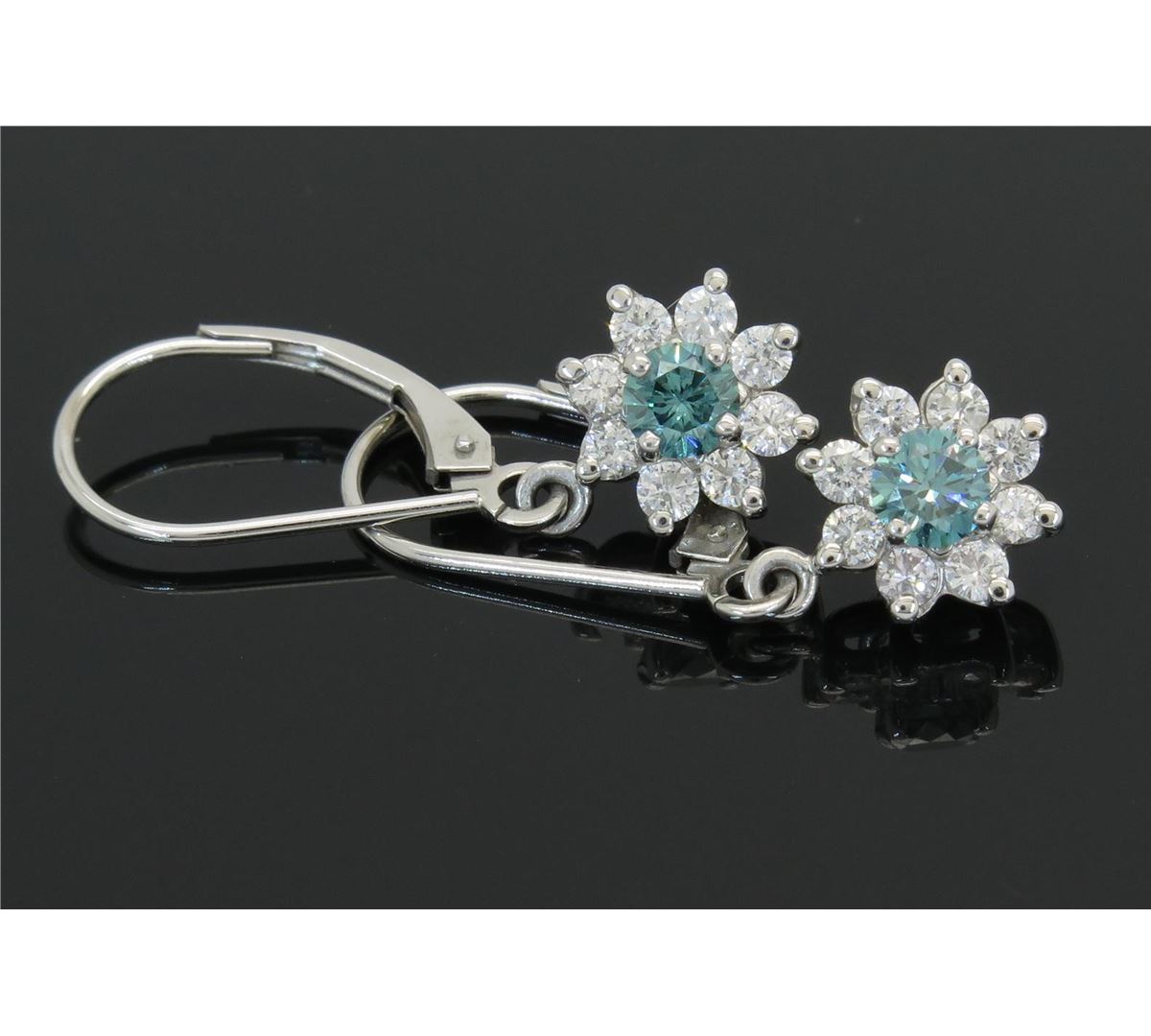 One tested pair of 14K white gold diamond earrings. Containing: 18 Round Brilliant Cut Diamonds. Clarity: I-SI, Color: G-I, two are blue. The blue diamonds have been irradiated to achieve their color. Approximate total diamond weight: 1.00CTW. All diamonds are graded in the mounting unless otherwise stated. Weight of earrings: 2.6 grams.
