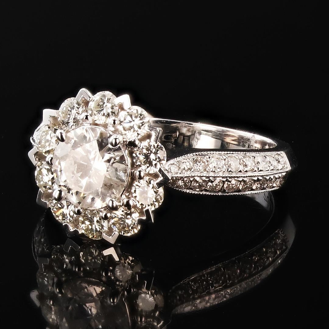 Name of Article: Lady's Diamond Ring Setting: 18 Kt. White Gold Mounting [5.20 gms] Cut: Round Brilliant Color: I Clarity: I2 Measurements: 6.38 x 6.33 x 3.85mm Approximate Weight: 1.00 Carat #Additional Stones/Information:# 46 Round Brilliant Cut Diamonds = 0.962 Ctw (Color: G-H, Clarity: VS-SI) Ring Size: 6.25 #Comments:# Value Based on Full Retail MSRP, Graded As Mounting Permits, Accent Diamond Quality is Expressed As An Average, Stamped: UCG 18K 750 #LREF-6799