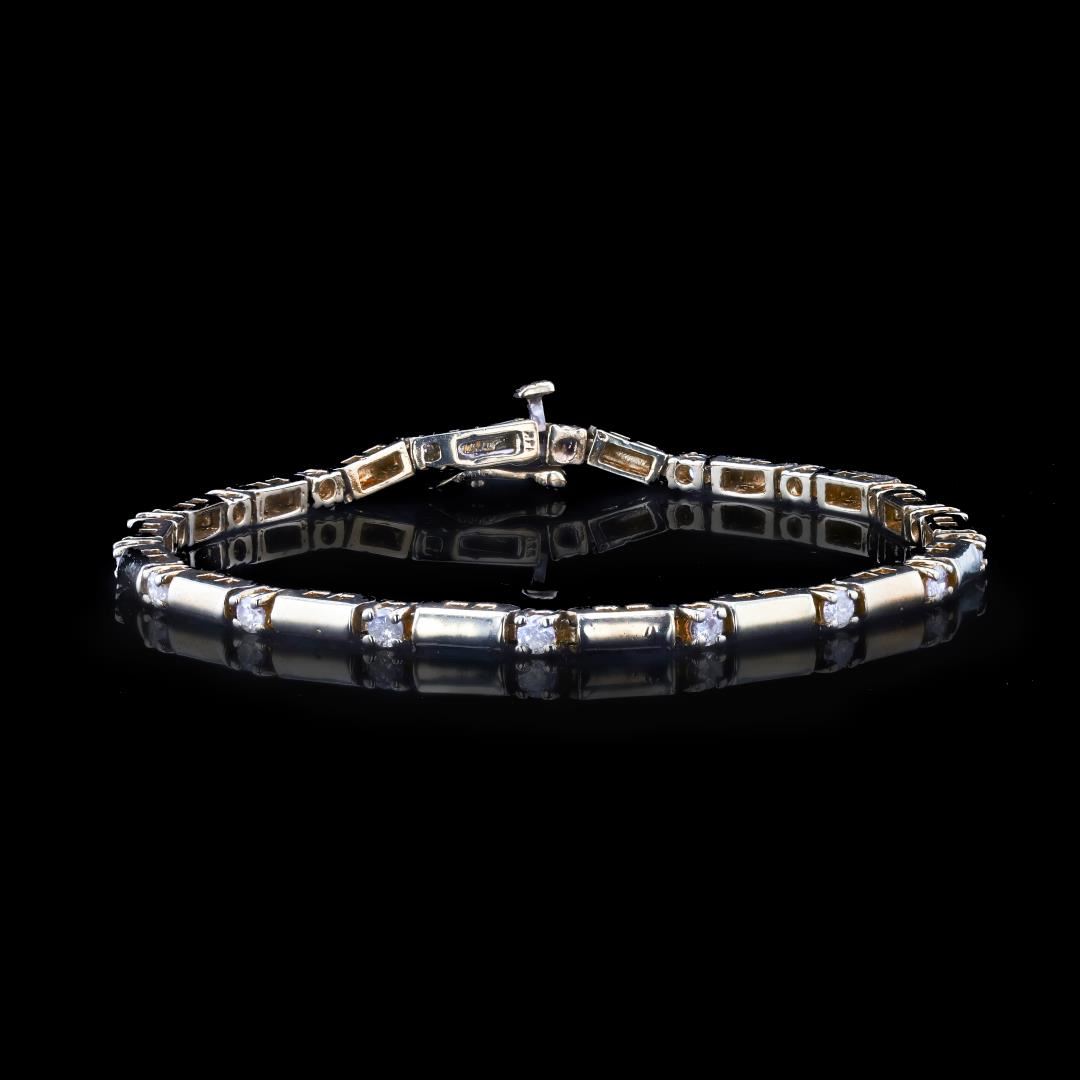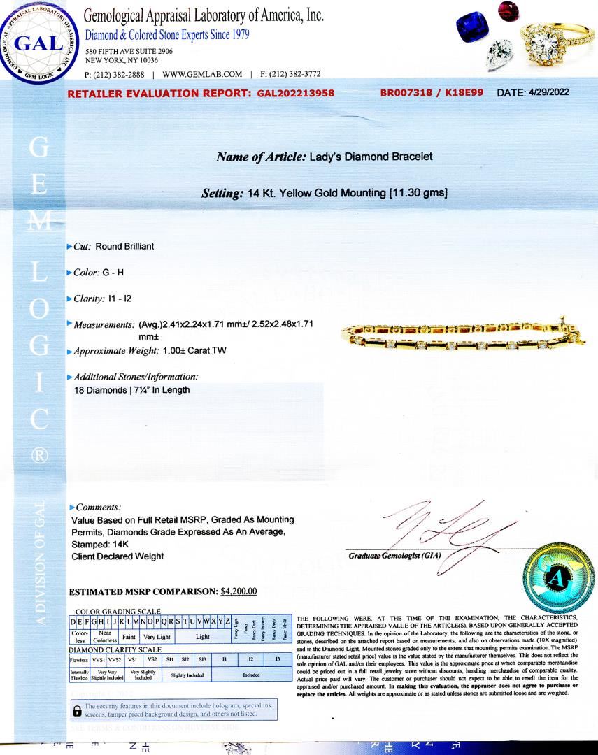 Name of Article: Lady's Diamond Bracelet Setting: 14 Kt. Yellow Gold Mounting [11.30 gms] Cut: Round Brilliant Color: G - H Clarity: I1 -I2 Measurements: (Avg.)2.41x2.24x1.71mm, 2.52x2.48x1.71mm Approximate Weight: 1.00 Carat TW Additional Stones/Information: 18 Diamonds 7 1/4 In Length #LREF-1899