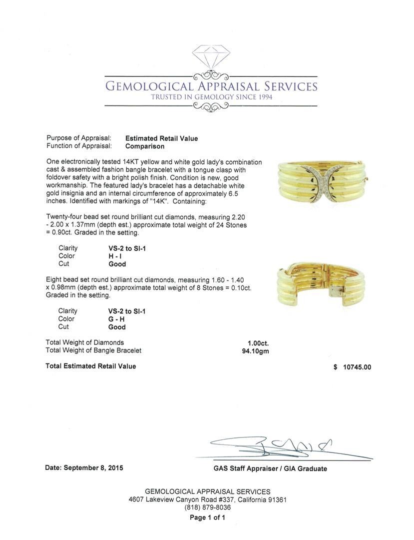 One electronically tested 14KT yellow and white gold lady's combination cast & assembled fashion bangle bracelet with a tongue clasp with foldover safety with a bright polish finish. The featured lady's bracelet has a detachable white gold insignia and an internal circumference of approximately 6.5 inches. Identified with markings of "14K". Condition is new, good workmanship. Containing: Twenty-Four bead set round brilliant cut diamonds, measuring 2.20 - 2.00 x 1.37mm (depth est.) approximate total weight of 24 Stones = 0.90ct. Graded in the setting. Clarity: VS-2 to SI-1. Color: H - I. Cut Good Eight bead set round brilliant cut diamonds, measuring 1.60 - 1.40 x 0.98mm (depth est.) approximate total weight of 8 Stones = 0.10ct. Graded in the setting. Clarity: VS-2 to SI-1. Color: G - Good. Total Weight of Diamonds 1.00ct. Total Weight of Bangle Bracelet 94.10gm. GAS Appraised at $10,745.00.