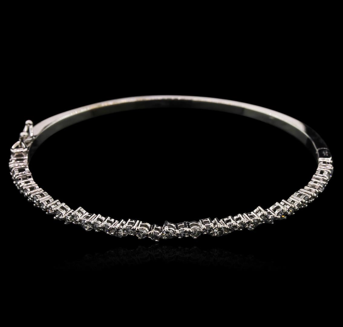 One electronically tested 14KT white gold lady's combination cast & assembled bangle bracelet with a tongue clasp with foldover safety with a straight line with a bright polish finish. Condition is new, good workmanship. Containing: Forty-One prong set round brilliant cut diamonds, measuring 1.90 - 1.80 x 1.17mm (depth est.) approximate total weight of 41 Stones = 1.00ct. Graded in the setting. Clarity: SI-2 to I-1. Color: I - Good. Total Weight of Diamonds 1.00ct. Total Weight of Bracelet 10.40gm. GAS Appraised at $3,970.00.