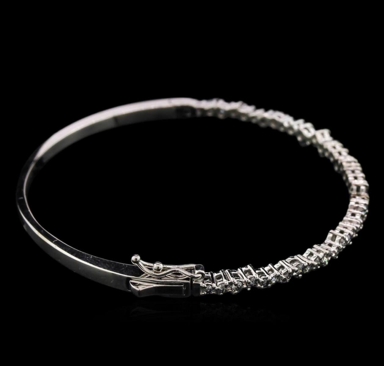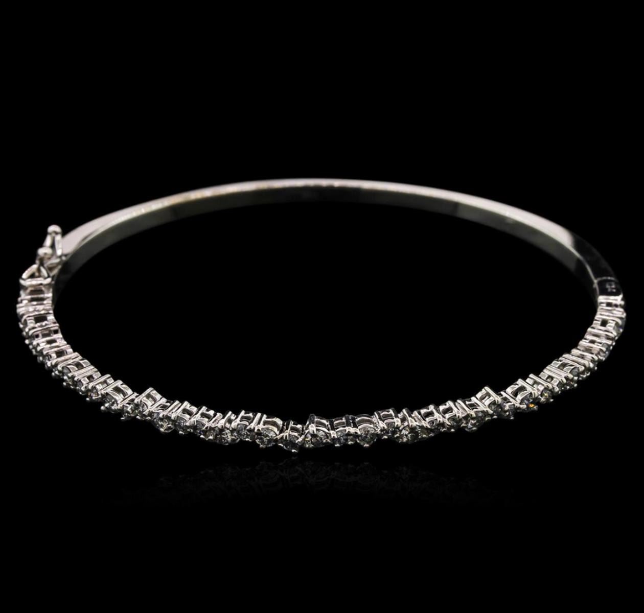 One electronically tested 14KT white gold lady's combination cast & assembled bangle bracelet with a tongue clasp with foldover safety with a straight line with a bright polish finish. Condition is new, good workmanship. Containing: Forty-One prong set round brilliant cut diamonds, measuring 1.90 - 1.80 x 1.17mm (depth est.) approximate total weight of 41 Stones = 1.00 ct. Graded in the setting. Clarity: SI-2 to I-1. Color: I - Good. Total Weight of Diamonds 1.00 ct. Total Weight of Bracelet 10.40gm. GAS Appraised.