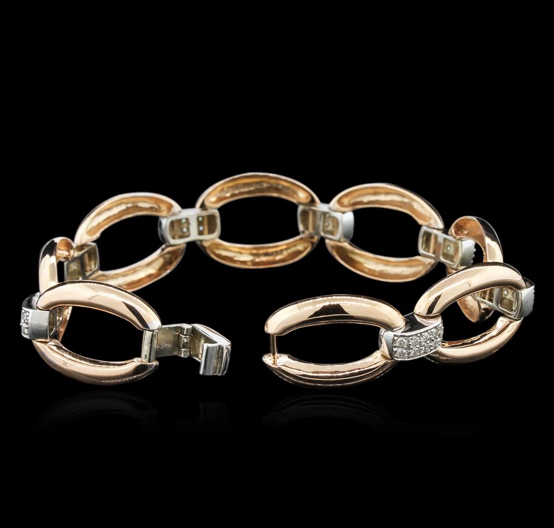 One electronically tested 14KT rose and white gold lady's combination cast & assembled bracelet with a foldover clasp with a bright polish finish. The featured bracelet is approximately 7.25" in length. Identified with markings of "14K". Condition is new, good workmanship. Containing: Seventy prong set round brilliant cut diamonds, measuring 1.60 - 1.50 x 0.93mm (depth est.) approximate. Total Weight of 70 Stones = 1.00ct. Graded in the setting. Clarity: SI-2 to I-1. Color: H - Good. Total Weight of Diamonds 1.00ct. Total Weight of Bracelet 24.20gm. GAS Appraised.