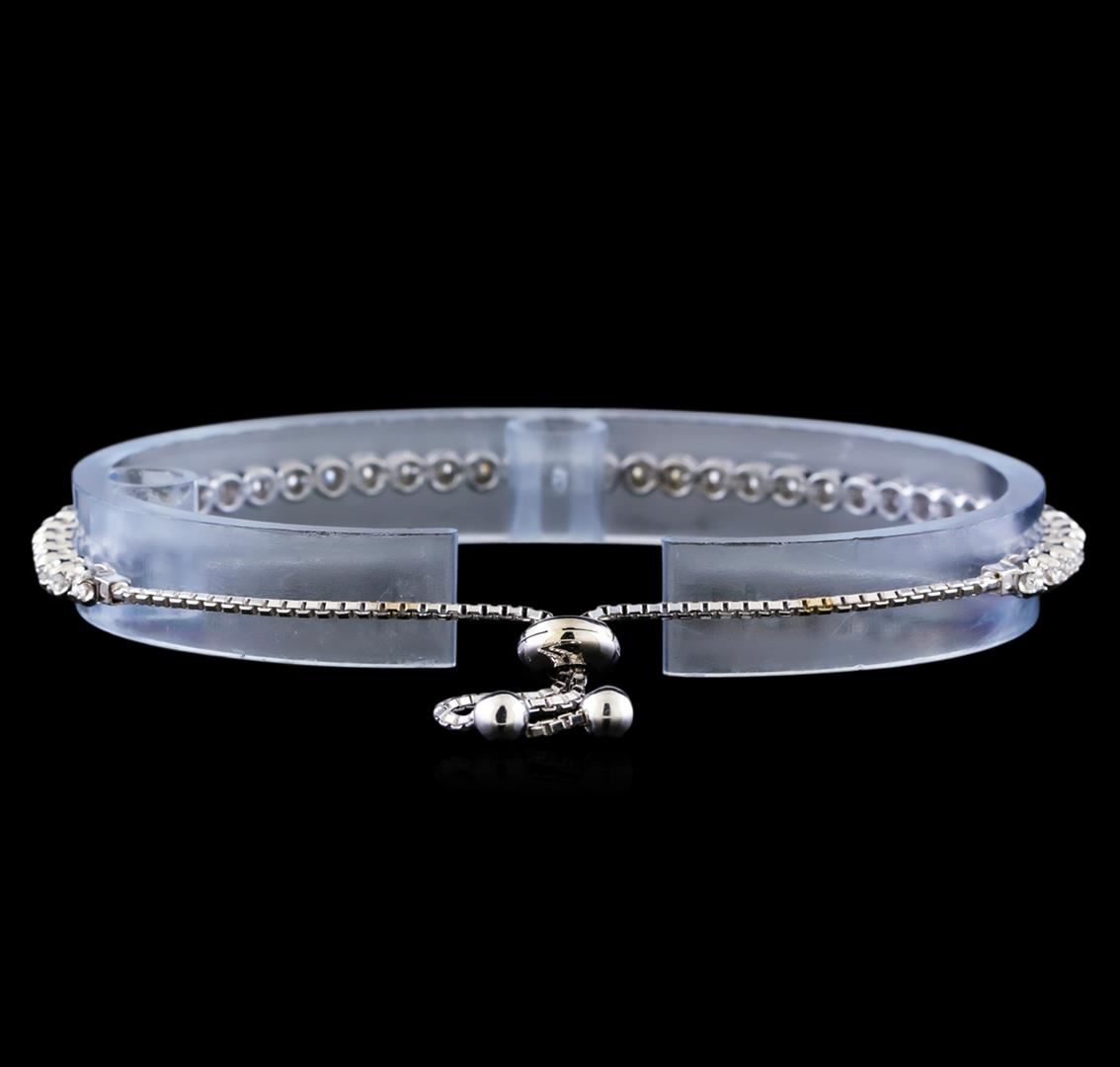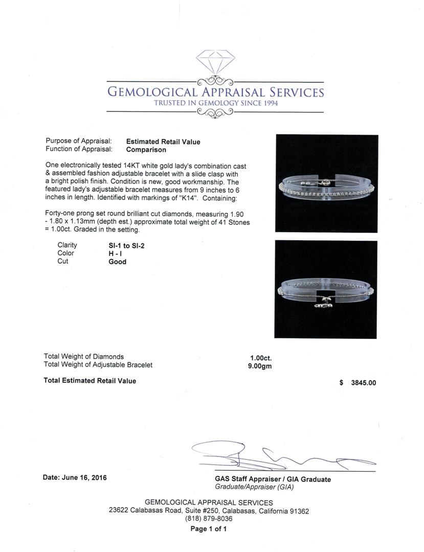 One electronically tested 14KT white gold lady's combination cast & assembled fashion adjustable bracelet with a slide clasp with a bright polish finish. The featured lady's adjustable bracelet measures from 9 inches to 6 inches in length. Identified with markings of "K14". Condition is new, good workmanship. Containing: Forty-One prong set round brilliant cut diamonds, measuring 1.90 - 1.80 x 1.13mm (depth est.) approximate total weight of 41 Stones = 1.00ct. Graded in the setting. Clarity: SI-1 to SI-2. Color: H - I. Cut Good. Total Weight of Diamonds 1.00ct. Total Weight of Adjustable Bracelet 9.00gm GAS Appraised at $3,845.00.