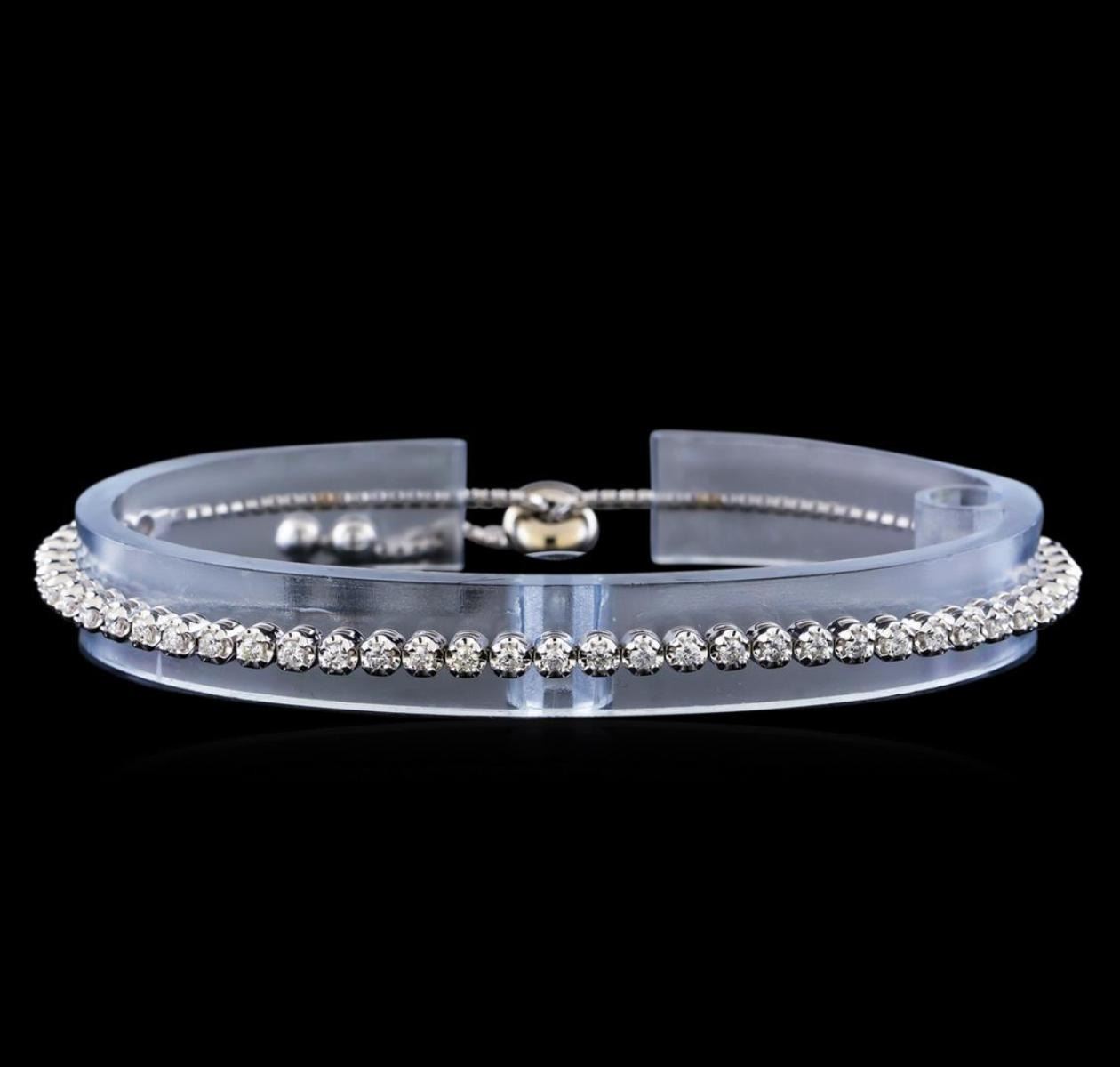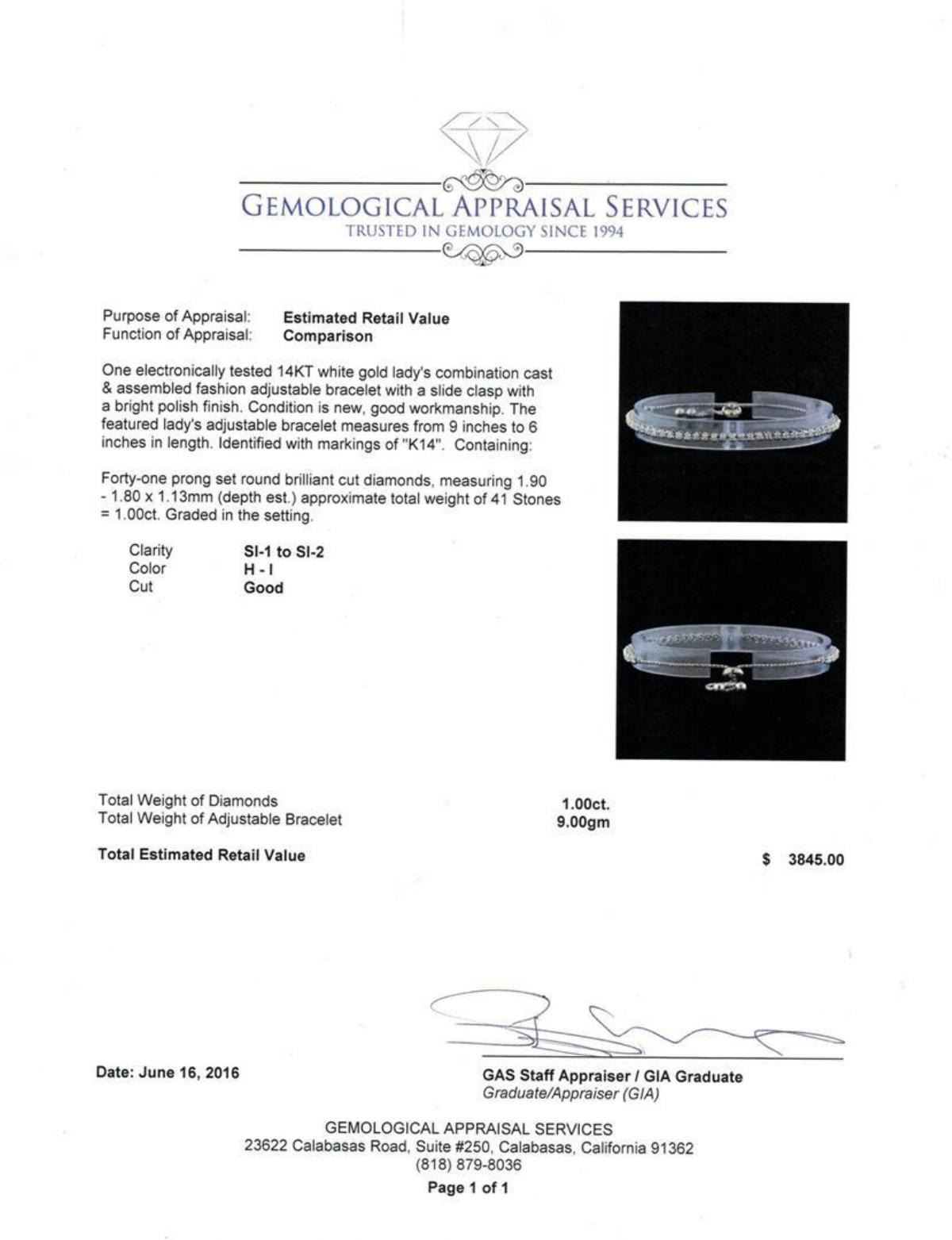One electronically tested 14KT white gold lady's combination cast & assembled fashion adjustable bracelet with a slide clasp with a bright polish finish. The featured lady's adjustable bracelet measures from 9 inches to 6 inches in length. Identified with markings of "K14". Condition is new, good workmanship. Containing: Forty-One prong set round brilliant cut diamonds, measuring 1.90 - 1.80 x 1.13mm (depth est.) approximate total weight of 41 Stones = 1.00ct. Graded in the setting. Clarity: SI-1 to SI-2. Color: H - I. Cut Good. Total Weight of Diamonds 1.00ct. Total Weight of Adjustable Bracelet 9.00gm GAS Appraised.