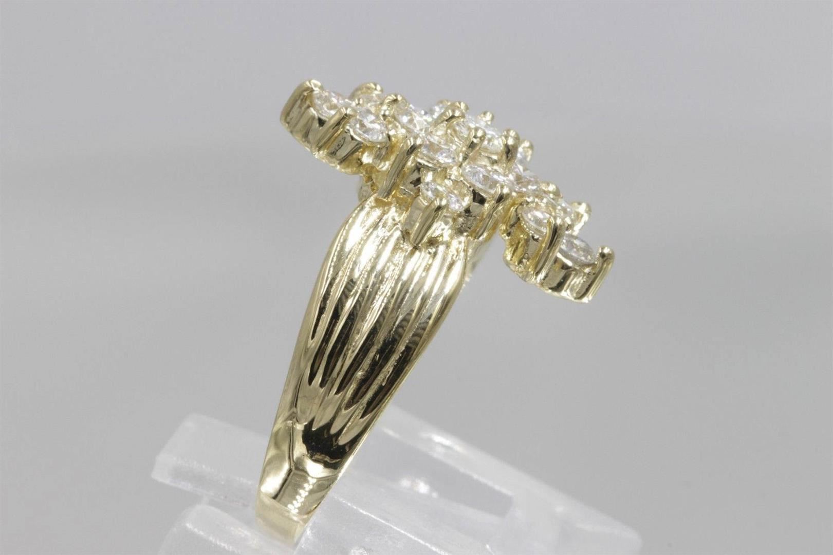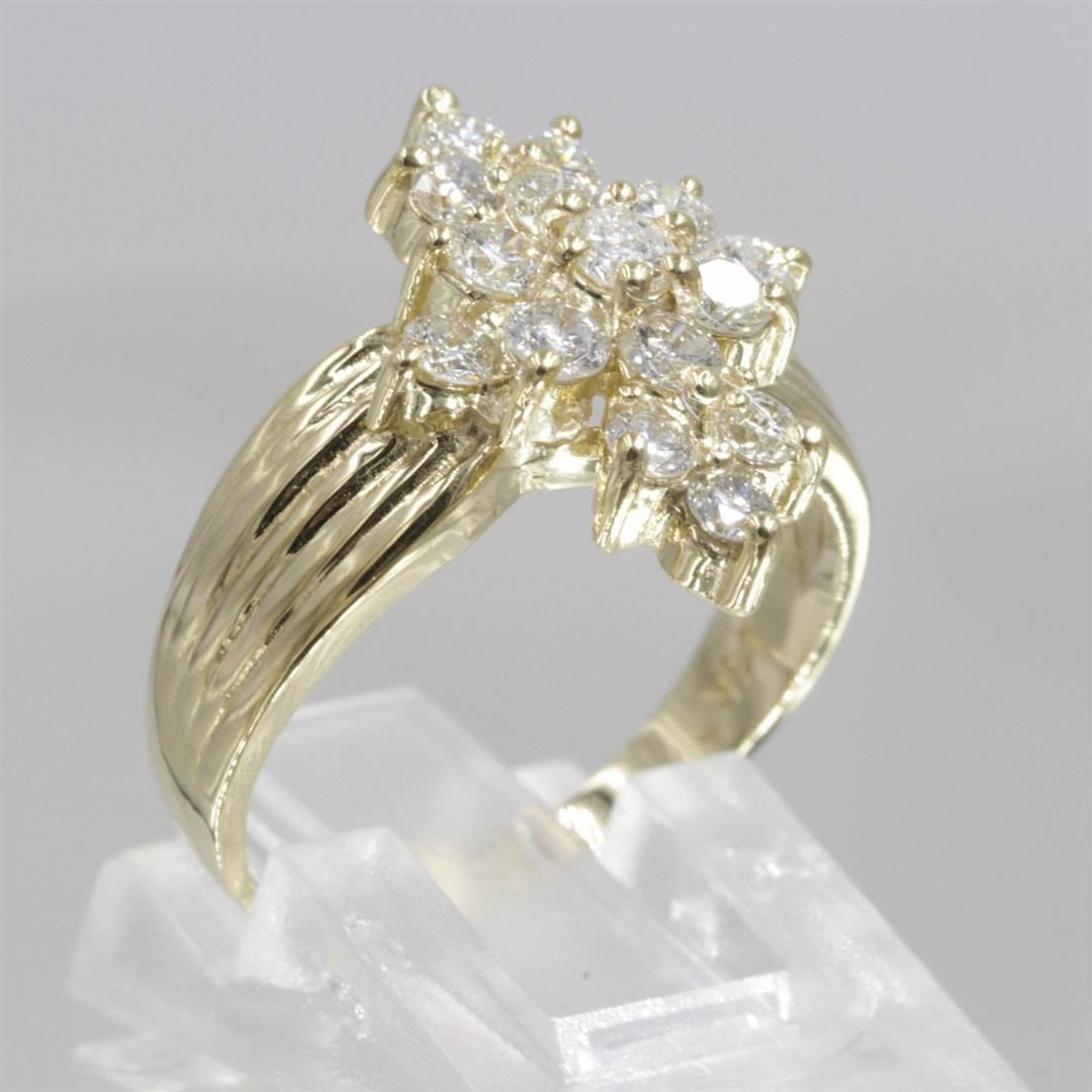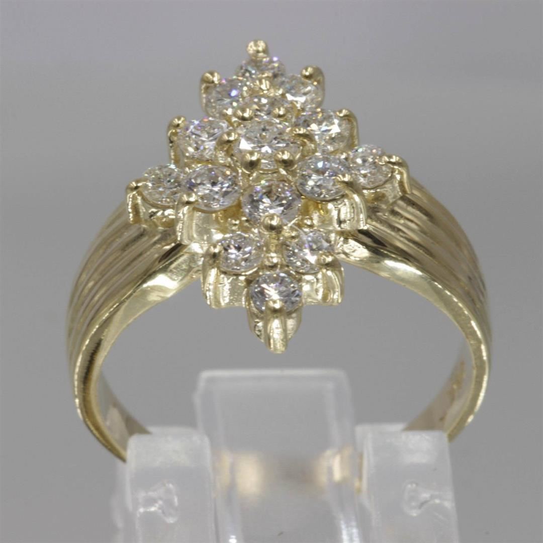 One diamond cluster ring featuring: 14KT yellow gold weighing 5.04 grams containing 15 diamonds weighing 1.00ctw. The diamonds are round brilliant cut with SI-1/SI-2 clarity and G-H color with excellent cut. The ring is a size 6.5 but is resizable.