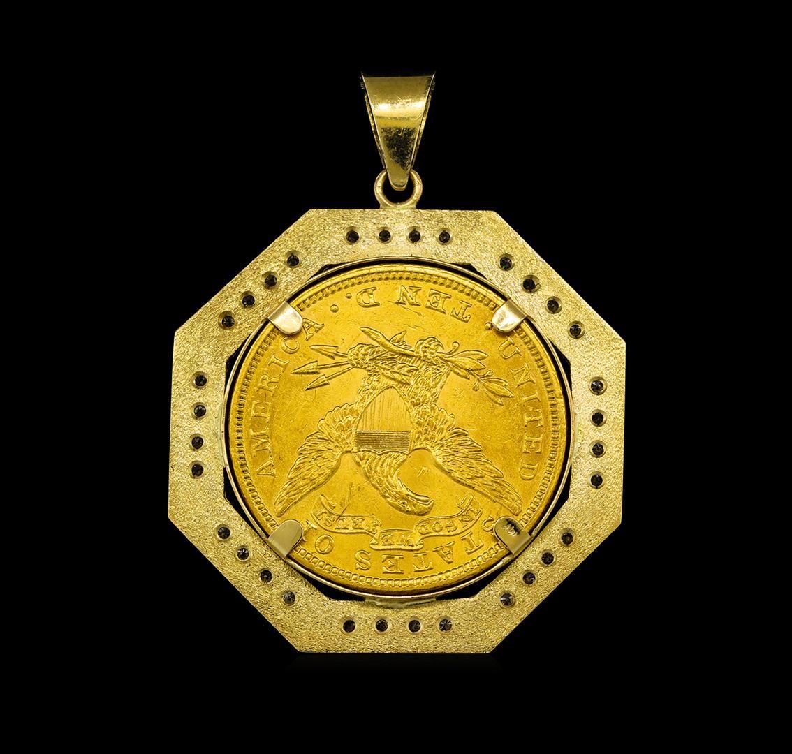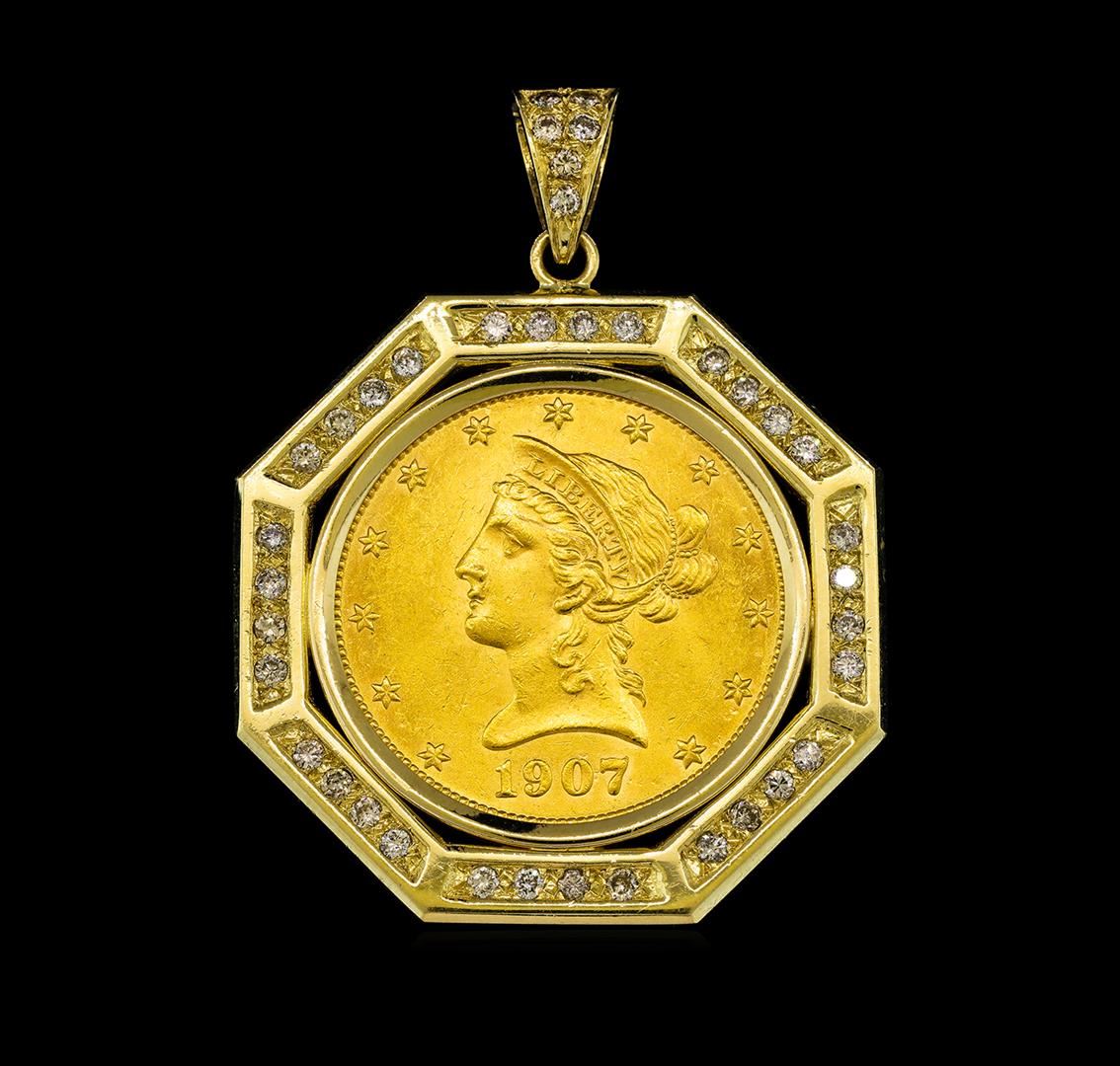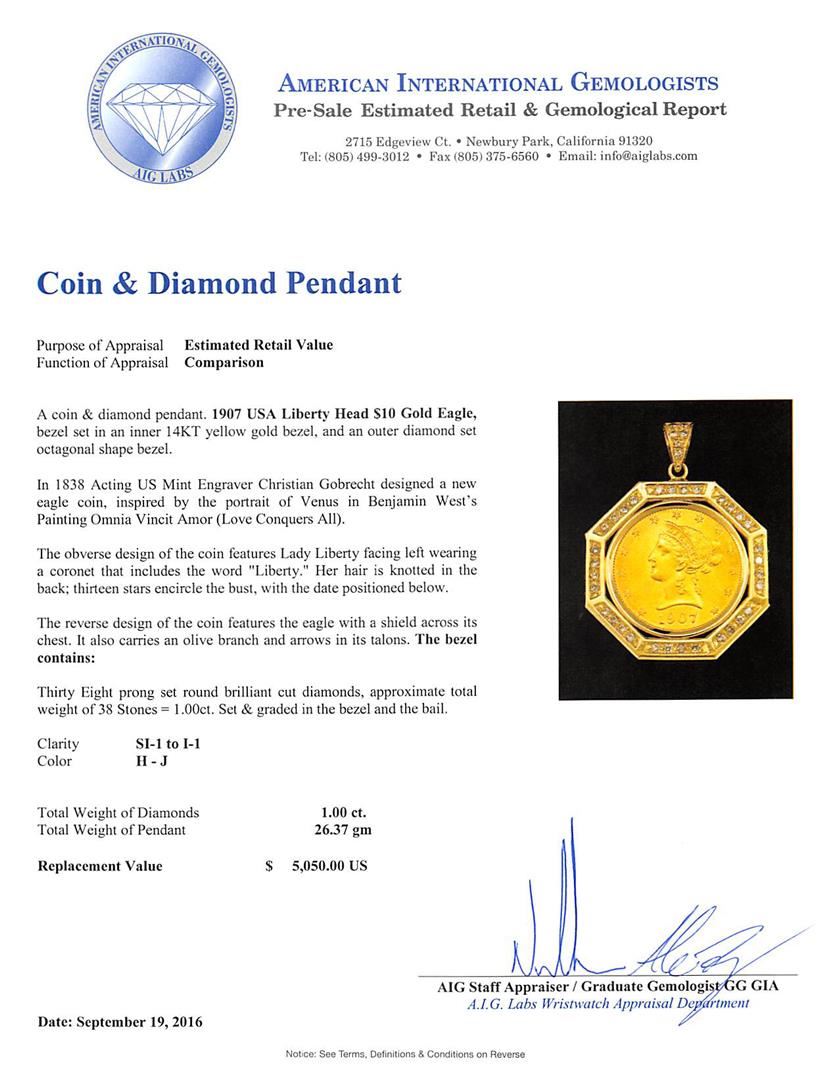 Coin & Diamond Pendant gold. A coin & diamond pendant. 1907 USA Liberty Head $10 Gold Eagle, bezel set in an inner 14KT yellow gold bezel, and an outer diamond set octagonal shape bezel. In 1838 Acting US Mint Engraver Christian Gobrecht designed a new eagle coin, inspired by the portrait of Venus in Benjamin West's Painting Omnia Vincit Amor (Love Conquers All). The obverse design of the coin features Lady Liberty facing left wearing a coronet that includes the word "Liberty." Her hair is knotted in the back; thirteen stars encircle the bust, with the date positioned below. The reverse design of the coin features the eagle with a shield across its chest. It also carries an olive branch and arrows in its talons. The bezel contains: Thirty Eight prong set round brilliant cut diamonds, approximate total weight of 38 Stones = 1.00ct. Set & graded in the bezel and the bail. Clarity SI-1 to I-1. Color H - J. Total Weight of Diamonds 1.00ct Total Weight of Pendant 26.37 gm. AIG Appraised at $25,150.00.