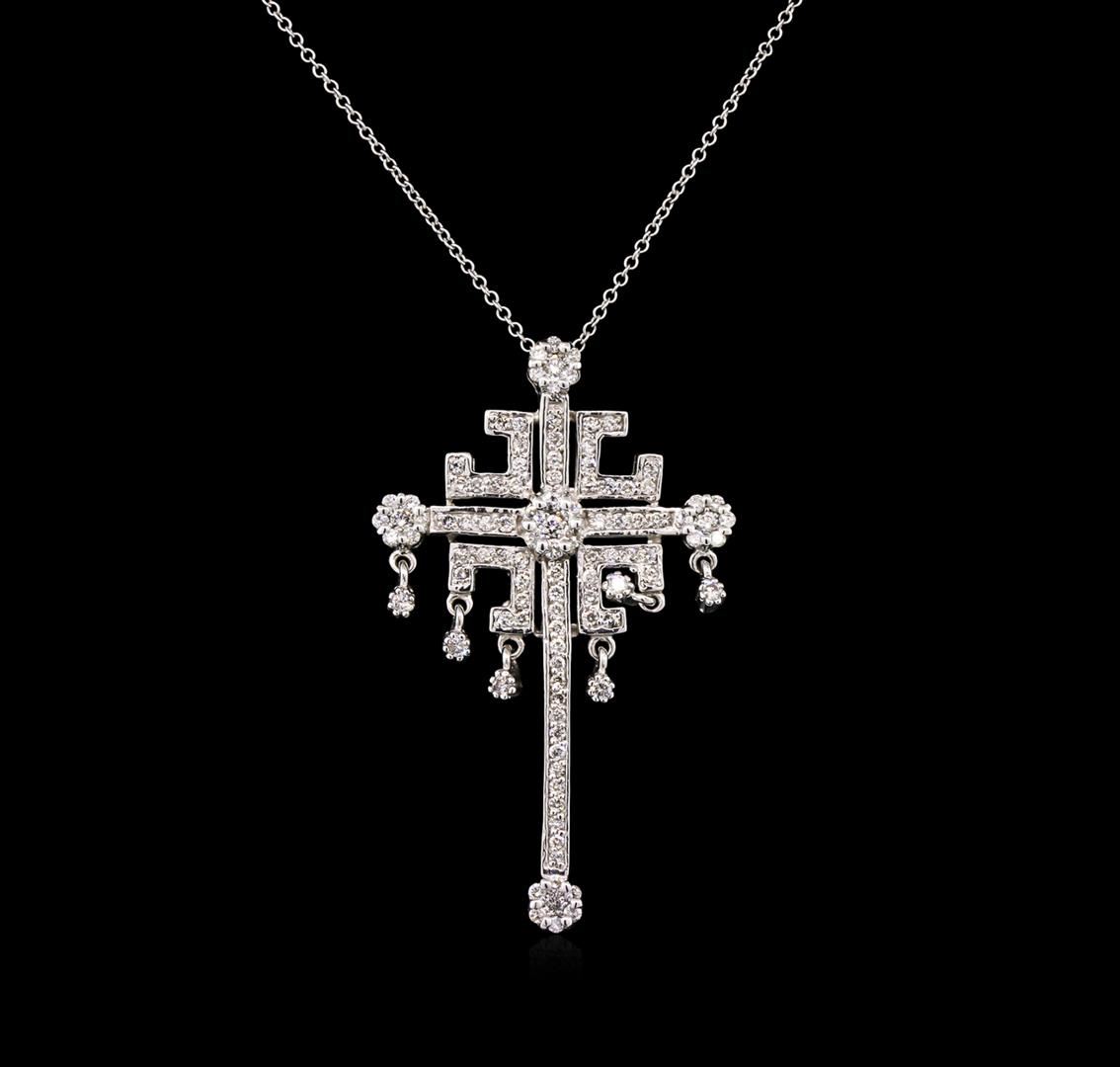 One cross pendant with chain featuring: 14KT white gold weighing 7.30 grams containing diamonds with a total approximate weight of 1.00ct.