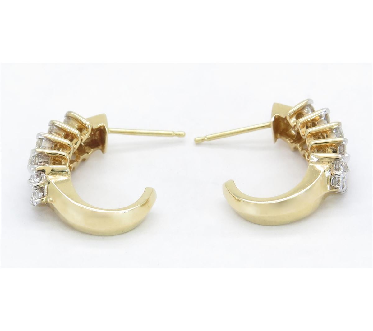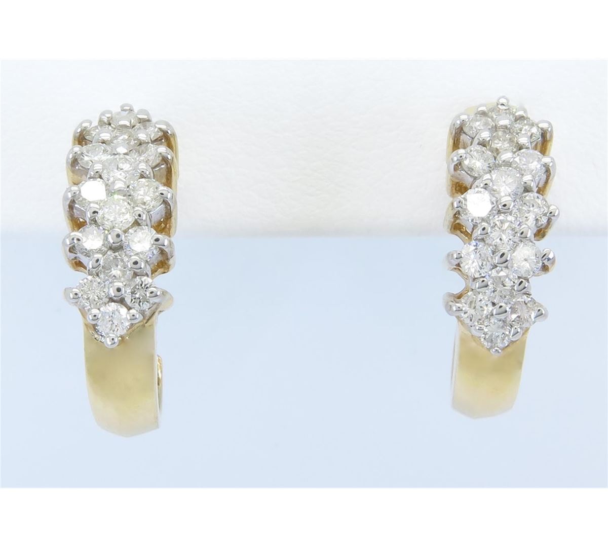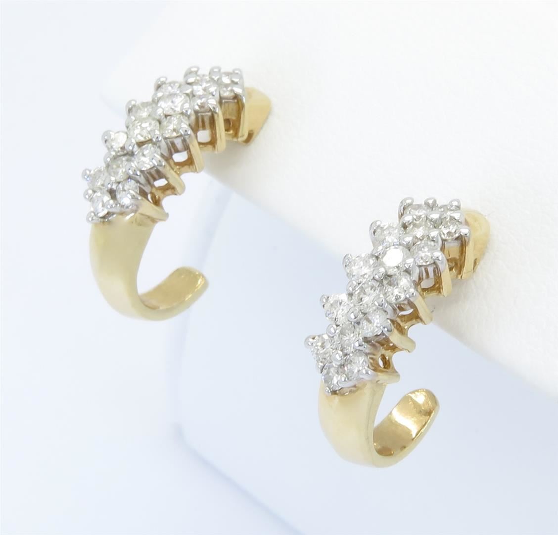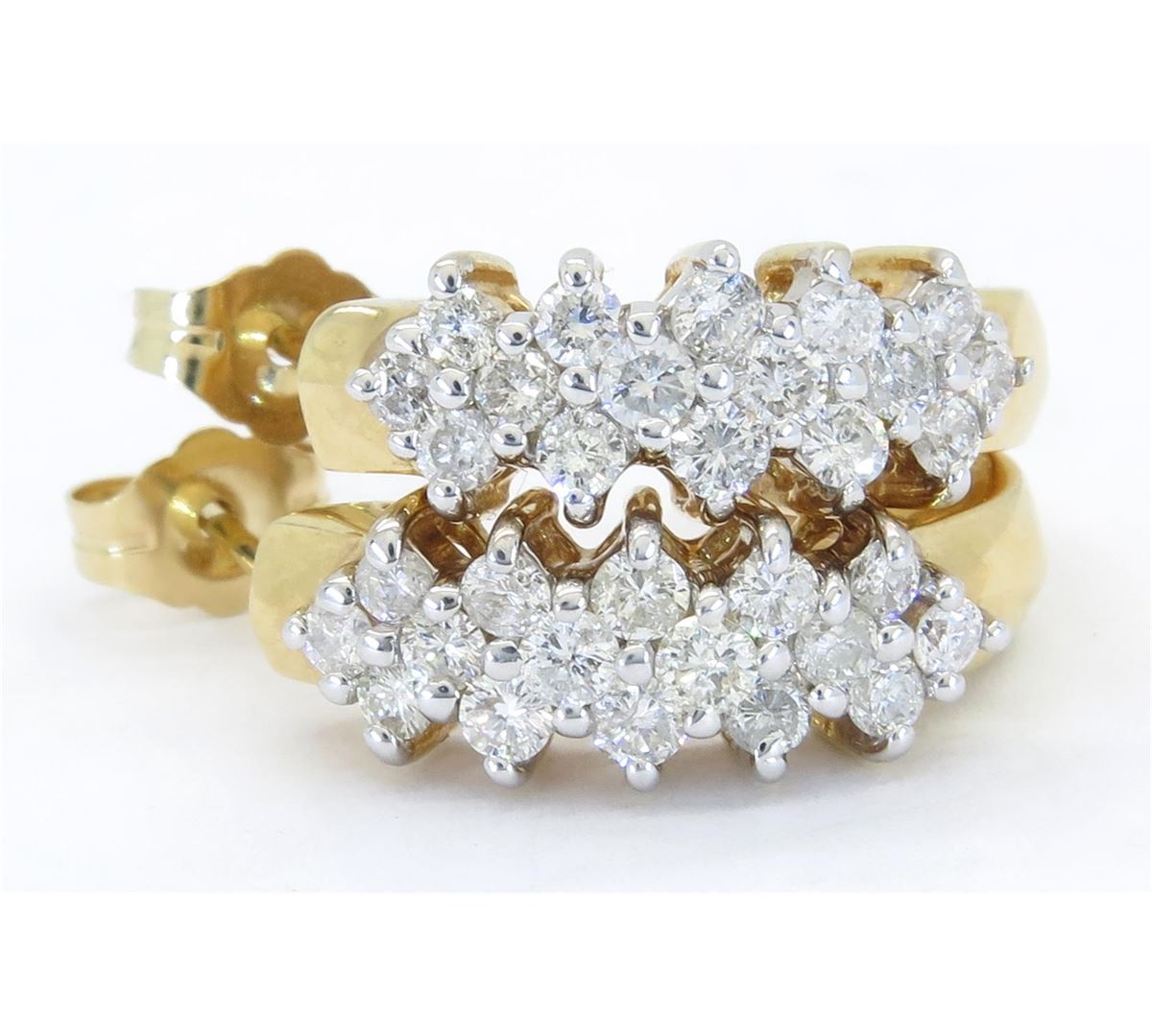 One pair of tested 14K yellow gold diamond earrings. Containing: 32 Round Brilliant Cut Diamonds. Clarity: I, Color: G-I. Approximate total diamond weight: 1CTW. Diamonds are graded in the mounting, unless otherwise stated. Weight: 5.6 grams.