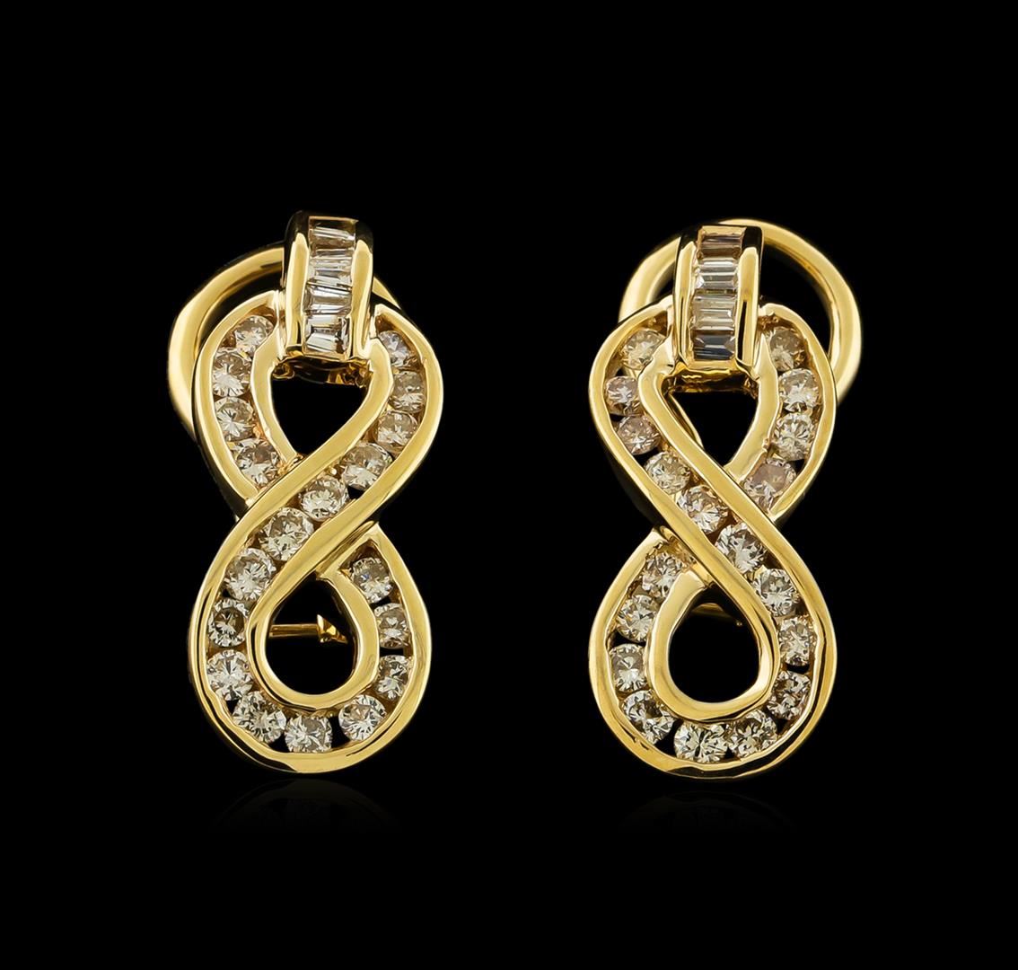 One pair electronically tested 14KT yellow gold ladies cast & assembled diamond earrings with omega backs. Each earring features a diamond figure eight ribbon completed by a diamond set post. Bright polish finish. Identified with markings of "14K". Condition is new, good workmanship. Containing: Thirty-Eight channel set round brilliant cut diamonds, measuring 2.00 - 1.70 x 1.11mm (depth est.) approximate total weight of 38 Stones = 0.88ct. Graded in the setting. Clarity: SI-2 to I-1. Color: G - I Ten channel set baguette cut (tapered) diamonds, measuring from 1.60 x 1.00 x 0.70mm (depth est.) to 1.70 x 1.20 x 0.84mm (depth est.) approximate total weight of 10 Stones = 0.12ct. Graded in the setting. Clarity: VS-2 to SI-1. Color: G - H. Total Weight of Diamonds 1.00ct. Total Weight of Earrings 5.39gm. AIG Appraised at $3,745.00.