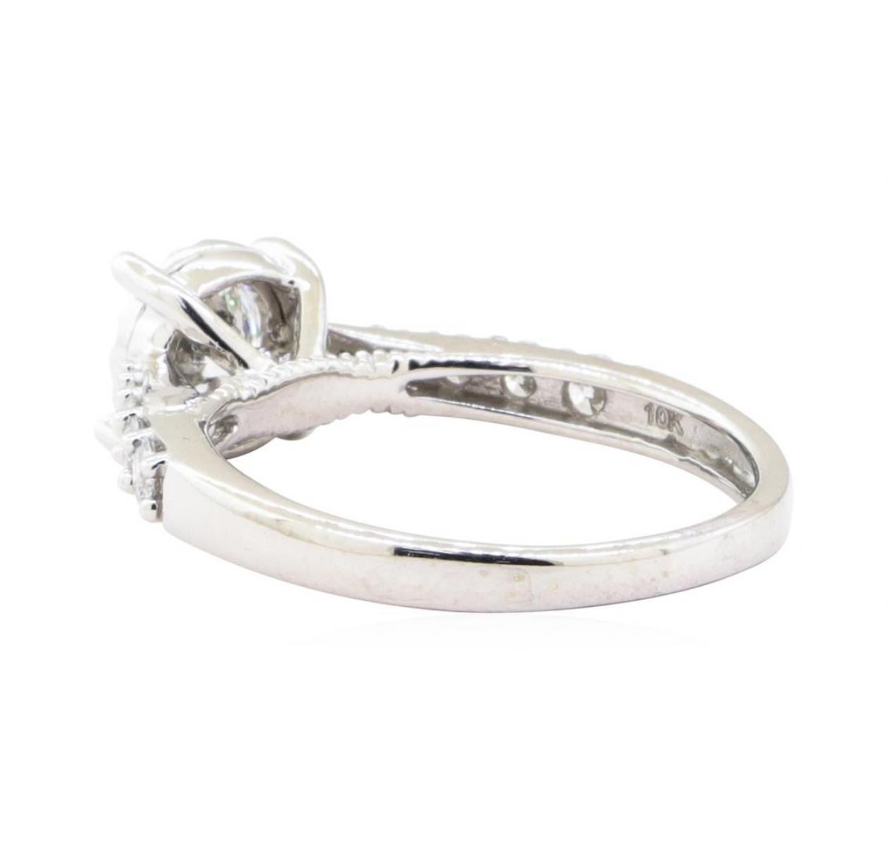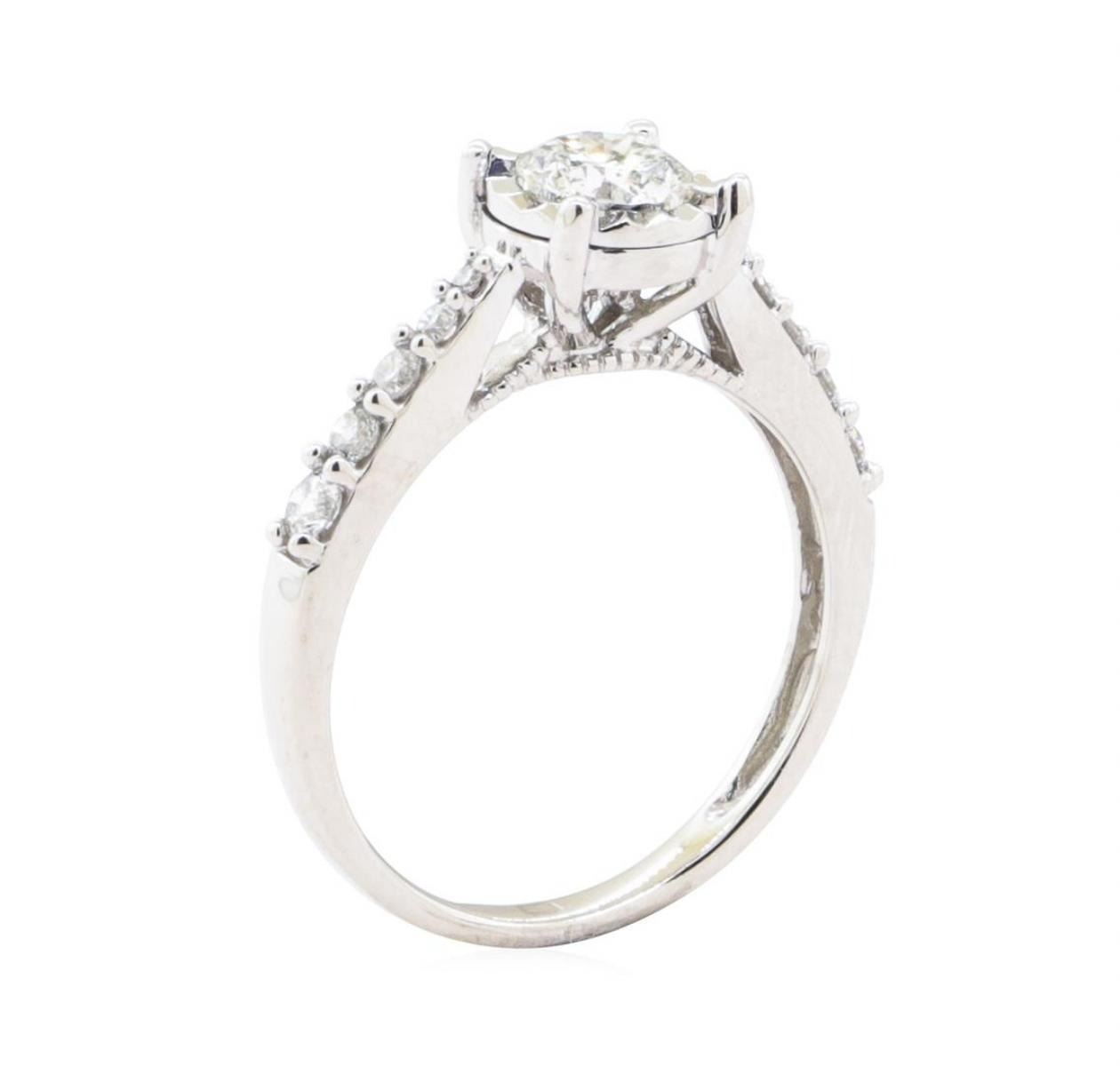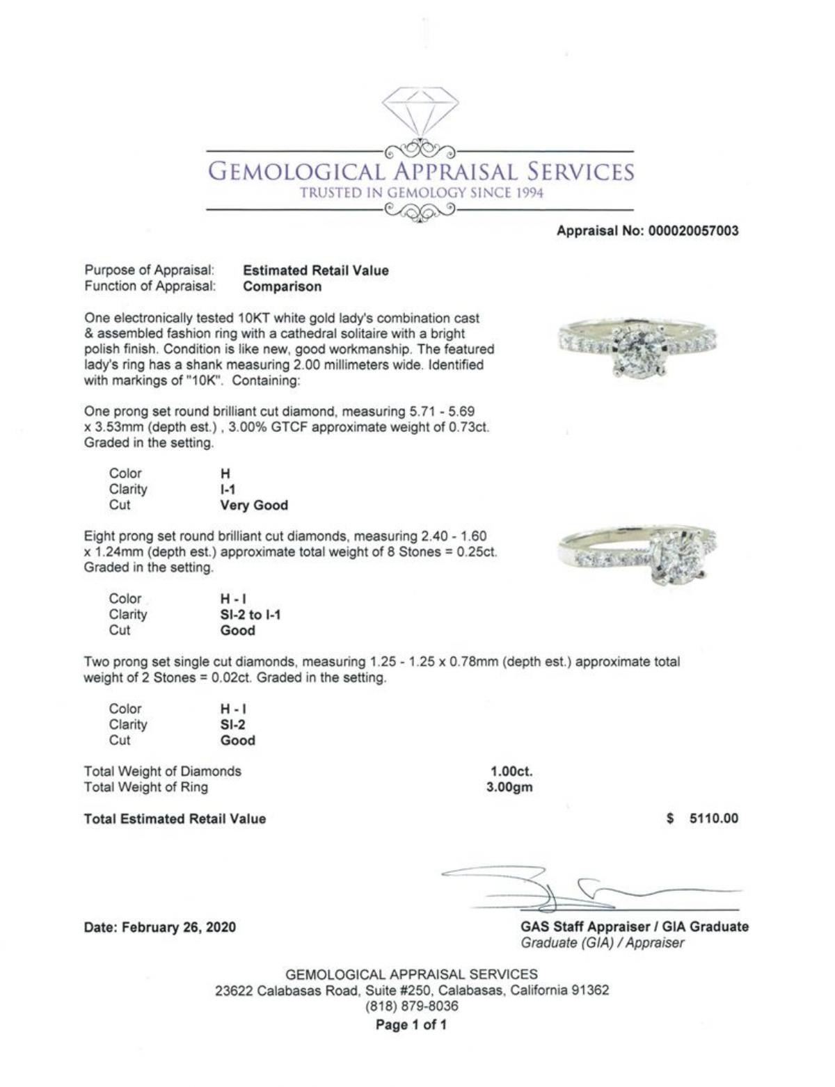 One electronically tested 10KT white gold lady's combination cast & assembled fashion ring with a cathedral solitaire with a bright polish finish. The featured lady's ring has a shank measuring 2.00 millimeters wide. Identified with markings of '10K'. Condition is Good. Containing: One prong set round brilliant cut diamond, measuring 5.71 - 5.69 x 3.53mm (depth est.) , 3.00.%. GTCF approximate weight of 0.73ct. Graded in the setting. Color H Clarity I-1 Cut Very Good Eight prong set round brilliant cut diamonds, measuring 2.40 - 1.60 x 1.24mm (depth est.) approximate total weight of 8 Stones = 0.25ct. Graded in the setting. Color H - I Clarity SI-2 to I-1 Cut Good Two prong set single cut diamonds, measuring 1.25 - 1.25 x 0.78mm (depth est.) approximate total weight of 2 Stones = 0.02ct. Graded in the setting. Color H - I Clarity SI-2 Cut Good. Total Weight of Diamonds 1.00 ct.. Total Weight of Ring 3.00gm GAS Appraised at $5110.00. GAS Appraised.