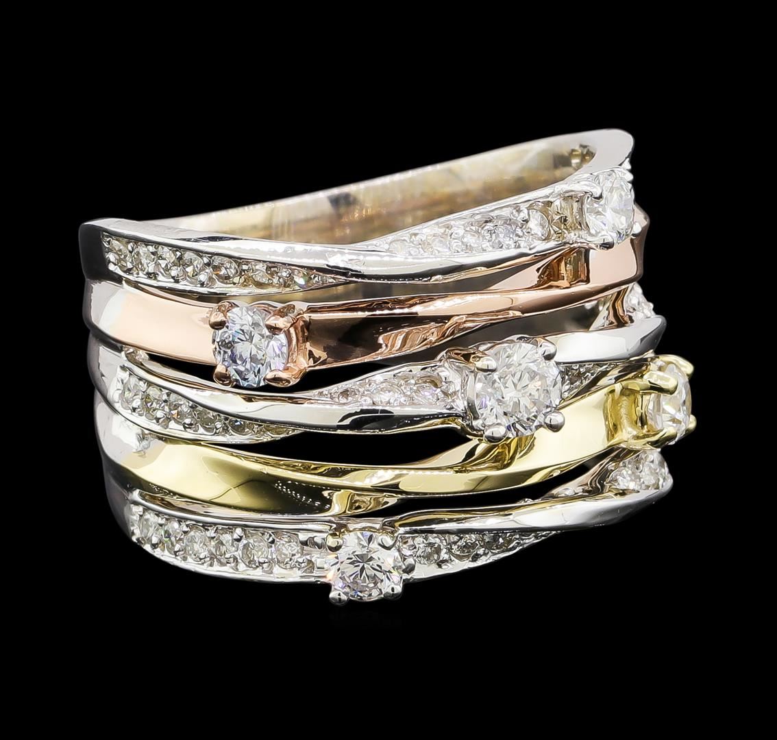 One electronically tested 14KT yellow, white, and rose gold lady's combination cast & assembled fashion ring with a five row wide band with a bright polish finish. The featured lady's ring has a shank measuring 6.40 millimeters wide. Identified with markings of '14K'. Condition is new, good workmanship. Containing: One prong set round brilliant cut diamond, measuring 3.45 - 3.40 x 2.13mm (depth est.) approximate weight of 0.15ct. Graded in the setting. Clarity I-1. Color: G - H Cut Good Four prong set round brilliant cut diamonds, measuring 3.10 - 2.80 x 1.83mm (depth est.) approximate total weight of 4 Stones = 0.40ct. Graded in the setting. Clarity SI-1 to SI-2. Color: G - H Cut Good Fifty-Four prong set round brilliant cut diamonds, measuring 1.35 - 1.25 x 0.81mm (depth est.) approximate total weight of 54 Stones = 0.45ct. Graded in the setting. Clarity SI-1 to SI-2. Color: H - I Cut Good. Total Weight of Diamonds 1.00ct.. Total Weight of Ring 9.90gm. GAS Appraised at $4,330.00.