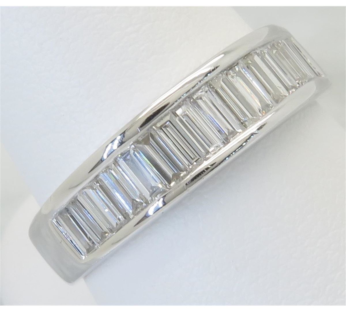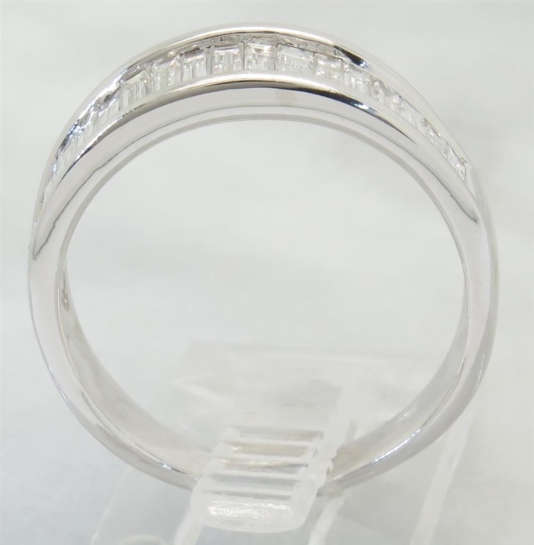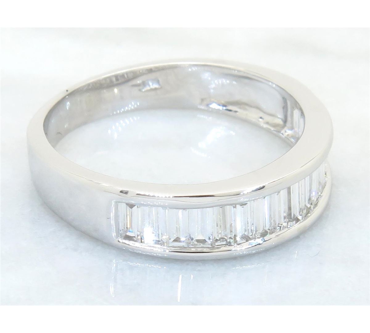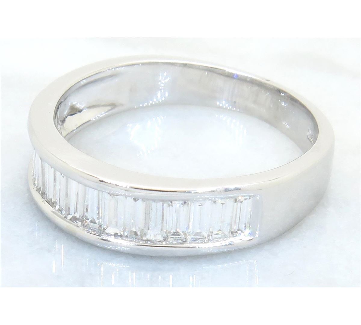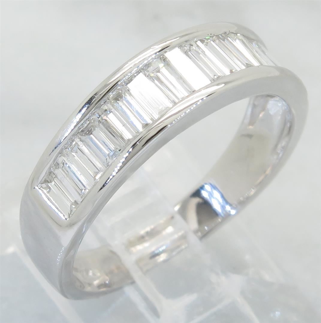 One tested 14K white gold diamond ring. Containing: 17 Baguette Cut Diamonds. Clarity: VS-SI, Color: F-H. Approximate total diamond weight: 1.00CTW. All diamonds are graded in the mounting unless otherwise stated. Weight of ring: 3.6 grams, Size: 7.25.