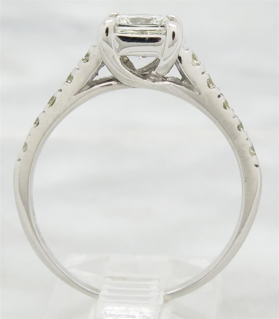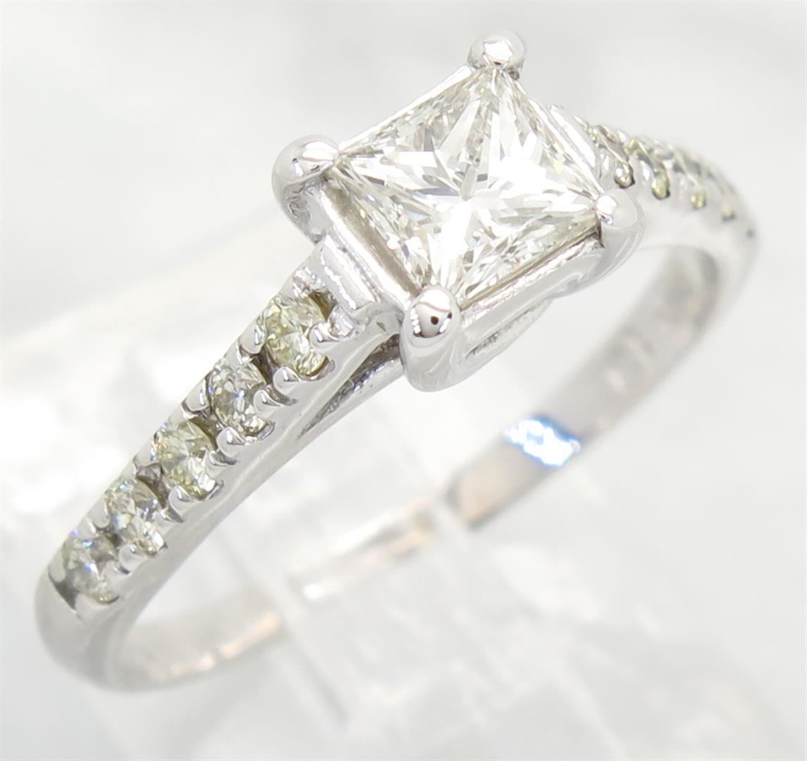 One tested 14K white gold diamond ring. Containing: One Princess Cut Diamond. Approximate Size: .70CT. Clarity: SI2, Color: G-H. 10 Round Brilliant Cut Diamonds. Approximate total diamond weight: 1.00CTW. All diamonds are graded in the mounting unless otherwise stated. Weight of ring: 2.9 grams, Size: 7.25