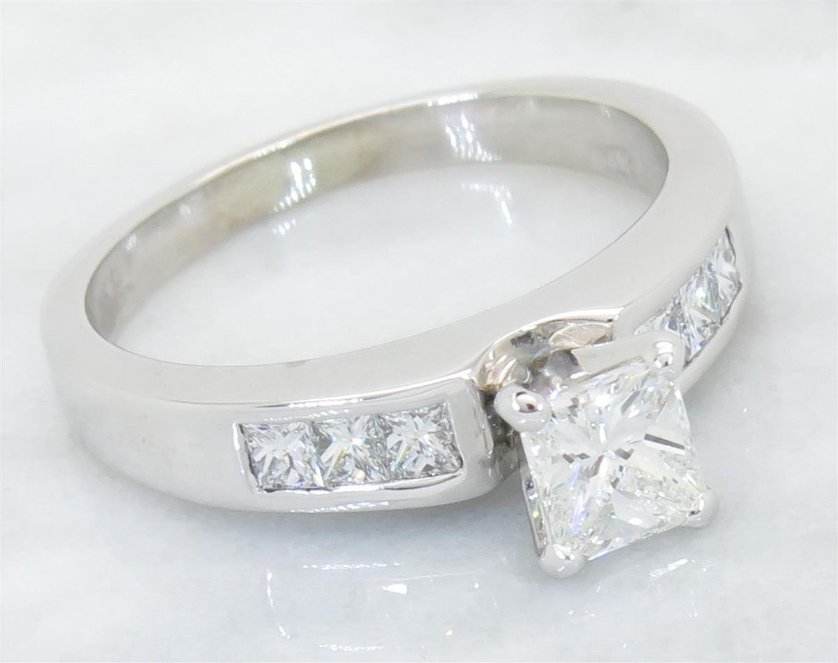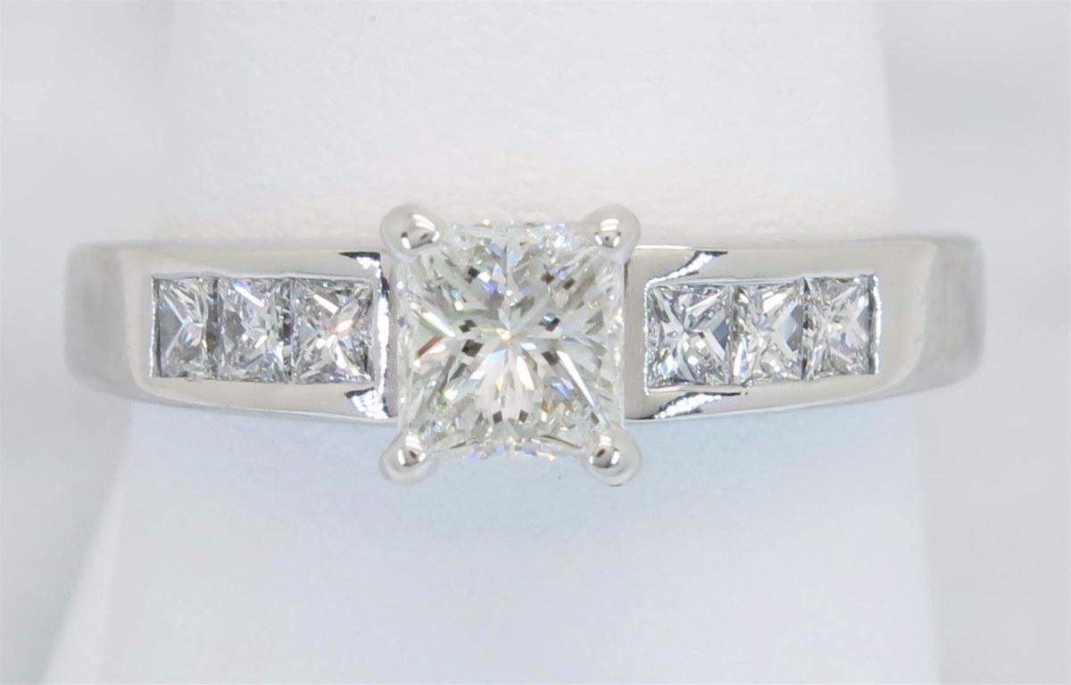 One tested 14K white gold diamond ring. Containing: One Princess Cut Diamond. Approximate Size: .58CT, Clarity: VS, Color: F-G. Six Princess Cut Diamonds. Approximate total diamond weight: 1.00CTW. All diamonds are graded in the mounting unless otherwise stated. Weight of ring: 4.4 grams, Size: 6.5.