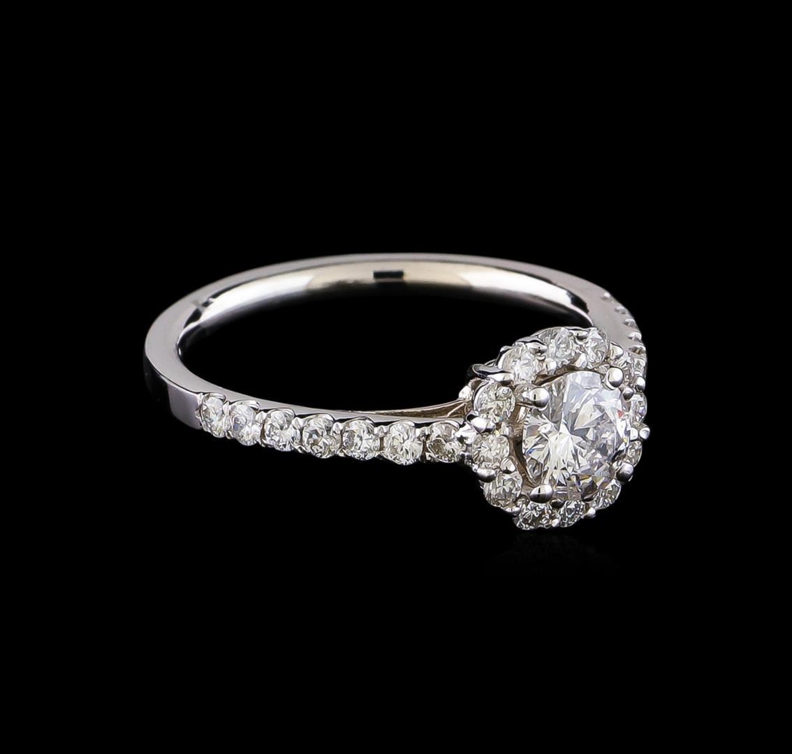 One electronically tested 14KT white gold lady's cast wedding ring with a cathedral halo with a bright polish finish. The featured lady's ring has a shank measuring 1.64 millimeters in width. Identified with markings of "14K". Condition is new, good workmanship. Containing: One prong set round brilliant cut diamond, measuring 5.25 - 5.16 x 3.13mm (depth est.) approximate weight of 0.51ct. Graded in the setting. Clarity: SI-1. Color: Good Twenty-Six prong set round brilliant cut diamonds, measuring 1.70 - 1.65 x 1.04mm (depth est.) approximate total weight of 26 Stones = 0.49ct. Graded in the setting. Clarity: SI-1 to I-2. Color: G - I. Cut Very Good. Total Weight of Diamonds 1.00ct. Total Weight of Ring 2.60gm. GAS Appraised at $5,415.00.