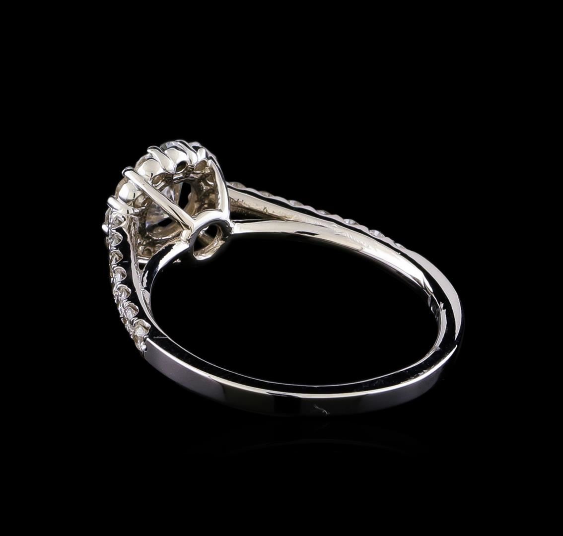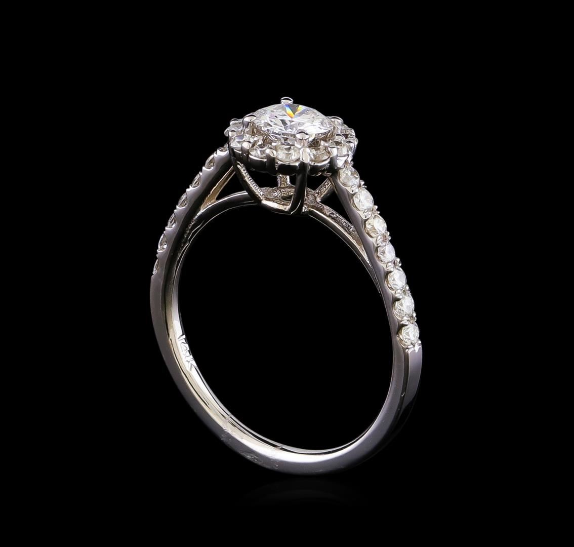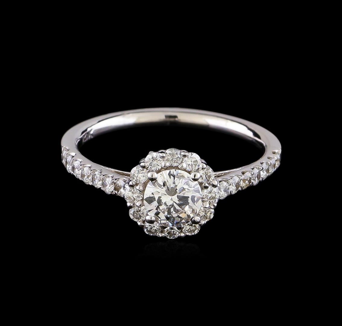 One electronically tested 14KT white gold lady's cast wedding ring with a cathedral halo with a bright polish finish. The featured lady's ring has a shank measuring 1.64 millimeters in width. Identified with markings of "14K". Condition is new, good workmanship. Containing: One prong set round brilliant cut diamond, measuring 5.25 - 5.16 x 3.13mm (depth est.) approximate weight of 0.51ct. Graded in the setting. Clarity: SI-1. Color: Good Twenty-Six prong set round brilliant cut diamonds, measuring 1.70 - 1.65 x 1.04mm (depth est.) approximate total weight of 26 Stones = 0.49ct. Graded in the setting. Clarity: SI-1 to I-2. Color: G - I. Cut Very Good. Total Weight of Diamonds 1.00ct. Total Weight of Ring 2.60gm. GAS Appraised at $5,415.00.