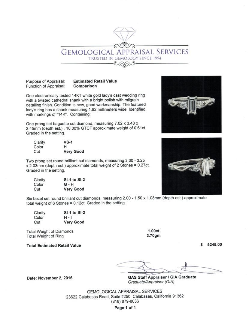 One electronically tested 14KT white gold lady's cast wedding ring with a twisted cathedral shank with a bright polish with milgrain detailing finish. The featured lady's ring has a shank measuring 1.82 millimeters wide. Identified with markings of '14K'. Condition is new, good workmanship. Containing: One prong set baguette cut diamond, measuring 7.02 x 3.48 x 2.45mm (depth est.) , 10.00.%. GTCF approximate weight of 0.61ct. Graded in the setting. Clarity VS-1. Color: H Cut Very Good Two prong set round brilliant cut diamonds, measuring 3.30 - 3.25 x 2.03mm (depth est.) approximate total weight of 2 Stones = 0.27ct. Graded in the setting. Clarity SI-1 to SI-2. Color: G - H Cut Very Good Six bezel set round brilliant cut diamonds, measuring 2.00 - 1.50 x 1.08mm (depth est.) approximate total weight of 6 Stones = 0.12ct. Graded in the setting. Clarity SI-1 to SI-2. Color: H - I Cut Very Good. Total Weight of Diamonds 1.00ct.. Total Weight of Ring 3.70gm. GAS Appraised at $5,245.00.