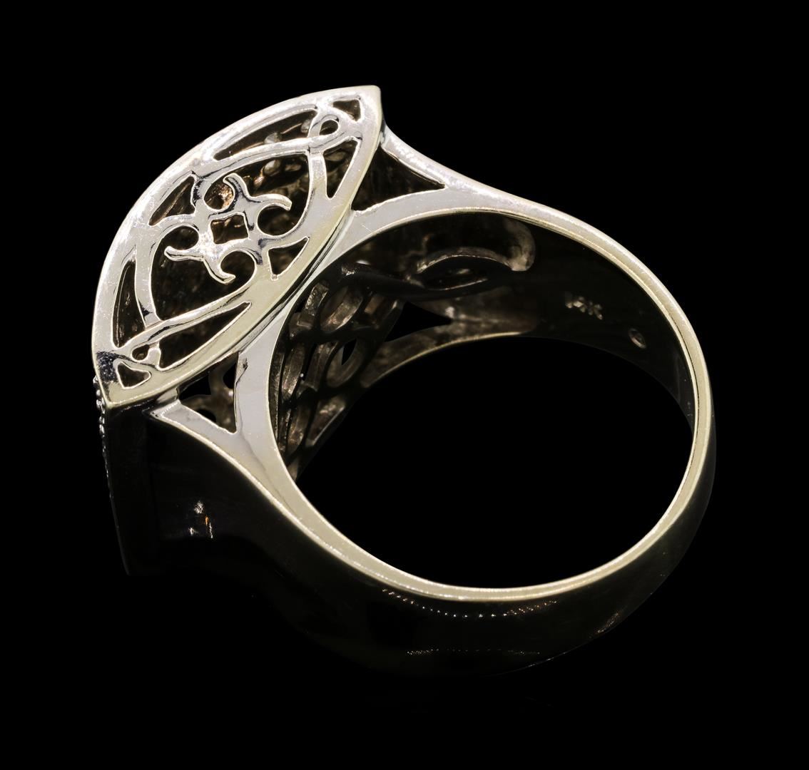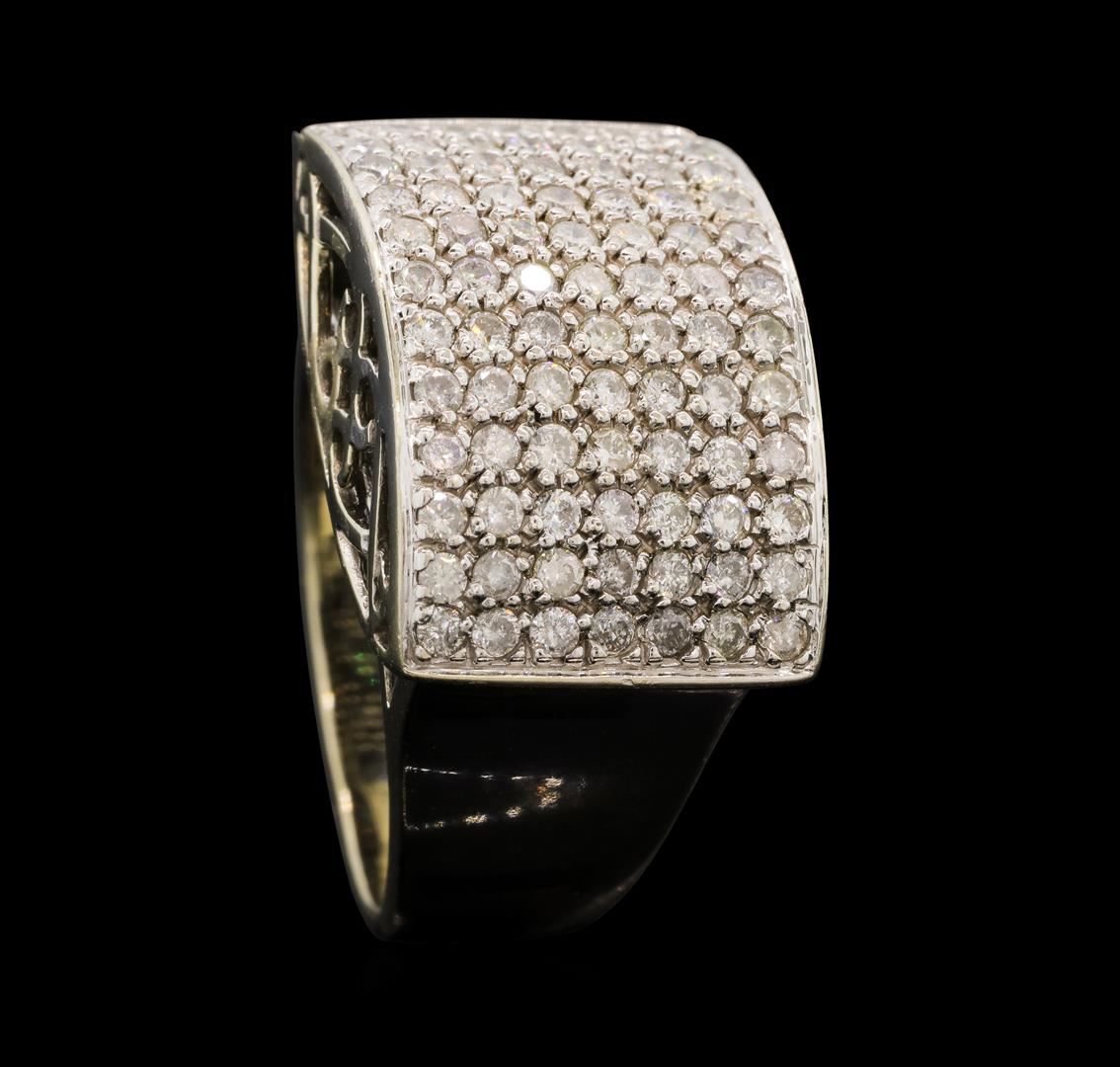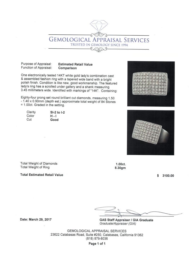 One electronically tested 14KT white gold lady's combination cast & assembled fashion ring with a tapered wide band with a bright polish finish. The featured lady's ring has a scrolled under gallery and a shank measuring 3.45 millimeters wide. Identified GAS Appraised at $3,100.00.