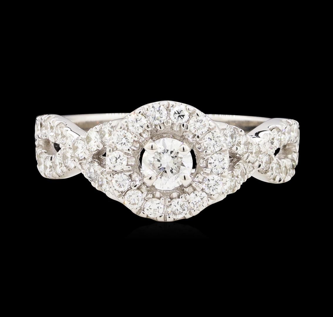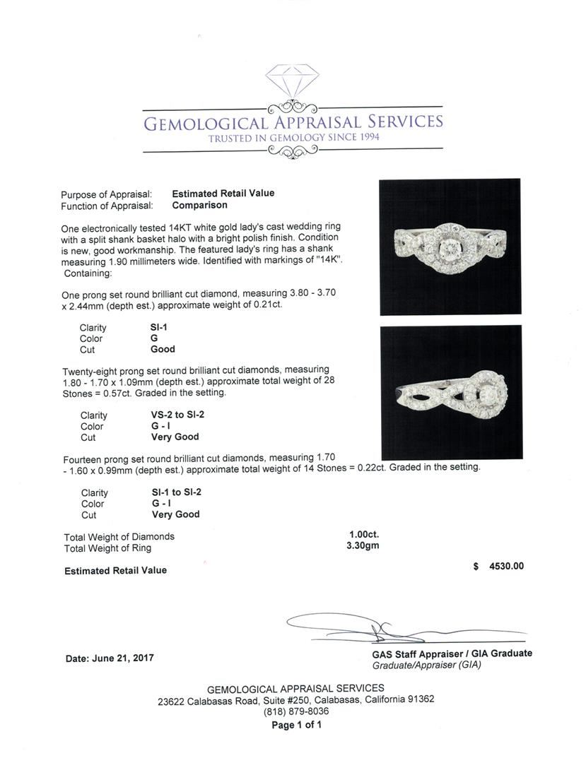 One electronically tested 14KT white gold lady's cast wedding ring with a split shank basket halo with a bright polish finish. The featured lady's ring has a shank measuring 1.90 millimeters wide. Identified with markings of '14K'. Condition is new, good workmanship. Containing: One prong set round brilliant cut diamond, measuring 3.80 - 3.70 x 2.44mm (depth est.) approximate weight of 0.21ct. Color G Clarity SI-1 Cut Good Twenty-Eight prong set round brilliant cut diamonds, measuring 1.80 - 1.70 x 1.09mm (depth est.) approximate total weight of 28 Stones = 0.57ct. Graded in the setting. Color G - I Clarity VS-2 to SI-2 Cut Very Good Fourteen prong set round brilliant cut diamonds, measuring 1.70 - 1.60 x 0.99mm (depth est.) approximate total weight of 14 Stones = 0.22ct. Graded in the setting. Color G - I Clarity SI-1 to SI-2 Cut Very Good. Total Weight of Diamonds 1.00ct.. Total Weight of Ring 3.30gm GAS Appraised at $4530.00. GAS Appraised at $4,530.00.