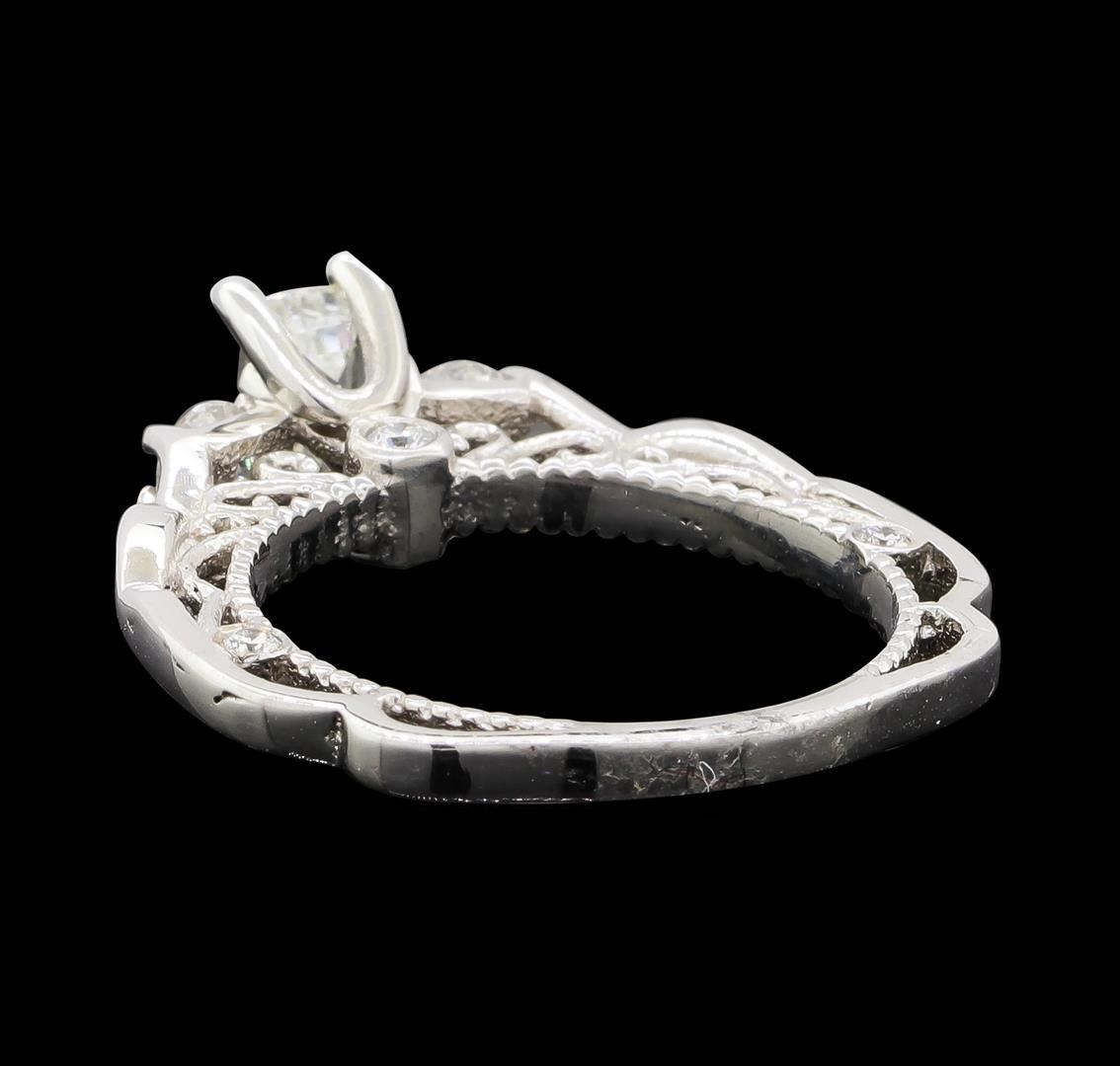 One electronically tested 14KT white gold lady's cast wedding ring with a twisted cathedral shank with a bright polish with milgrain detailing finish. The featured lady's ring has a shank measuring 1.82 millimeters wide. Identified with markings of '14K'. Condition is new, good workmanship. Containing: One prong set baguette cut diamond, measuring 7.02 x 3.48 x 2.45mm (depth est.) , 10.00.%. GTCF approximate weight of 0.61ct. Graded in the setting. Clarity VS-1. Color: H Cut Very Good Two prong set round brilliant cut diamonds, measuring 3.30 - 3.25 x 2.03mm (depth est.) approximate total weight of 2 Stones = 0.27ct. Graded in the setting. Clarity SI-1 to SI-2. Color: G - H Cut Very Good Six bezel set round brilliant cut diamonds, measuring 2.00 - 1.50 x 1.08mm (depth est.) approximate total weight of 6 Stones = 0.12ct. Graded in the setting. Clarity SI-1 to SI-2. Color: H - I Cut Very Good. Total Weight of Diamonds 1.00ct.. Total Weight of Ring 3.70gm. GAS Appraised at $5,245.00.