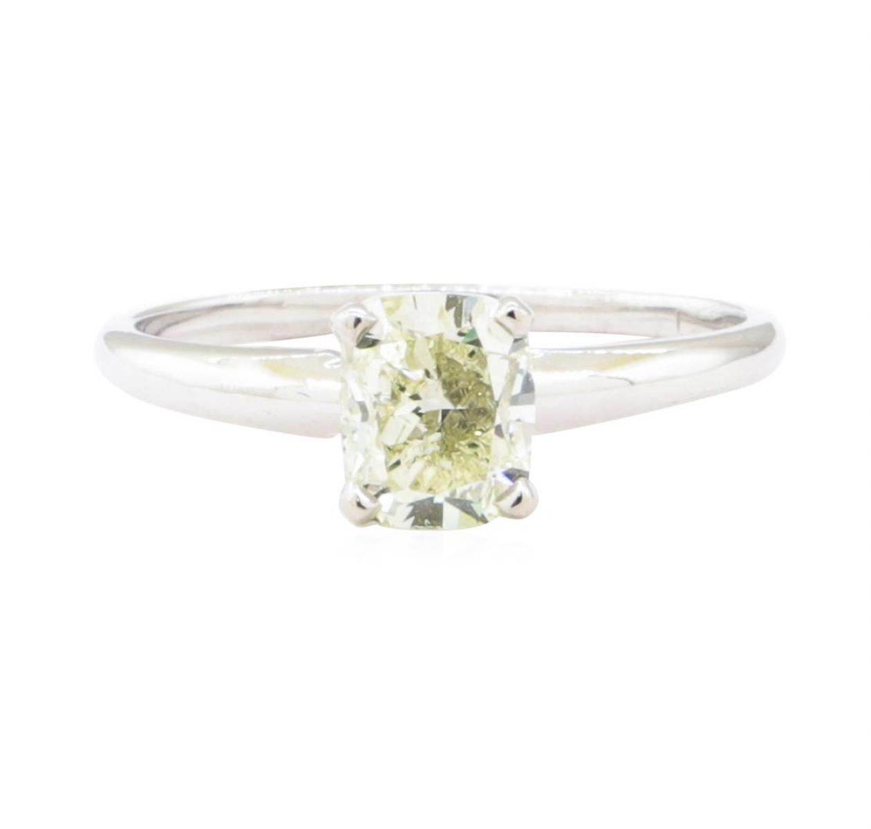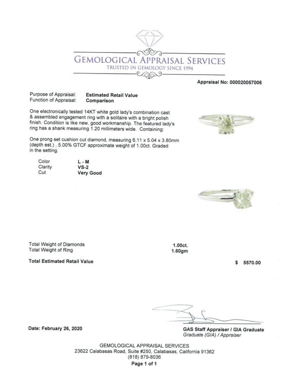 One electronically tested 14KT white gold lady's combination cast & assembled engagement ring with a solitaire with a bright polish finish. The featured lady's ring has a shank measuring 1.20 millimeters wide. Condition is Good. Containing: One prong set cushion cut diamond, measuring 6.11 x 5.04 x 3.80mm (depth est.) , 5.00.%. GTCF approximate weight of 1.00 ct. Graded in the setting. Color L - M Clarity VS-2 Cut Very Good. Total Weight of Diamonds 1.00 ct.. Total Weight of Ring 1.60gm GAS Appraised at $5570.00. GAS Appraised.