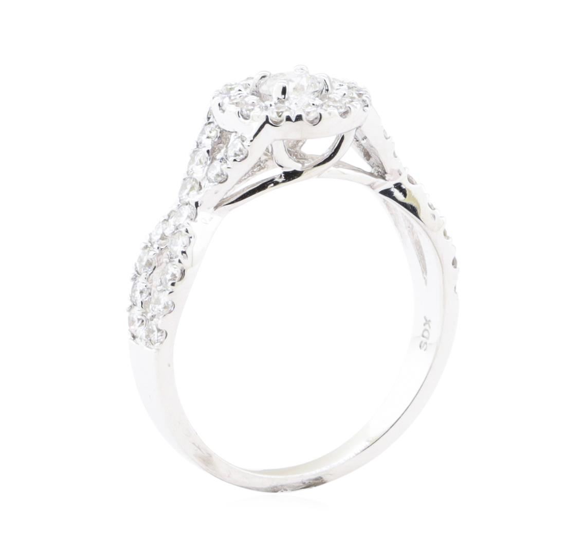 One electronically tested 14KT white gold lady's cast wedding ring with a split shank basket halo with a bright polish finish. The featured lady's ring has a shank measuring 1.90 millimeters wide. Identified with markings of '14K'. Condition is new, good workmanship. Containing: One prong set round brilliant cut diamond, measuring 3.80 - 3.70 x 2.44mm (depth est.) approximate weight of 0.21ct. Color G Clarity SI-1 Cut Good Twenty-Eight prong set round brilliant cut diamonds, measuring 1.80 - 1.70 x 1.09mm (depth est.) approximate total weight of 28 Stones = 0.57ct. Graded in the setting. Color G - I Clarity VS-2 to SI-2 Cut Very Good Fourteen prong set round brilliant cut diamonds, measuring 1.70 - 1.60 x 0.99mm (depth est.) approximate total weight of 14 Stones = 0.22ct. Graded in the setting. Color G - I Clarity SI-1 to SI-2 Cut Very Good. Total Weight of Diamonds 1.00 ct.. Total Weight of Ring 3.30gm GAS Appraised at $4530.00. GAS Appraised.